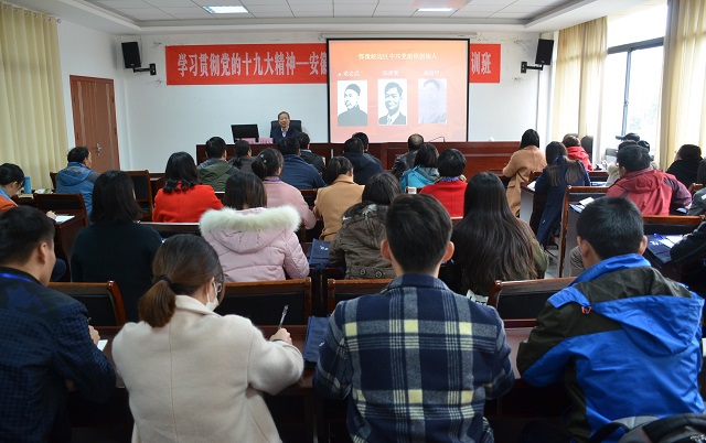 11月18日—19日,培训班学员冒着刺骨的寒风坐了4个多小时的车程来到了安徽金寨干部学院。培训班邀请了金寨县红军历史研究会会长阎荣安教授作了做题为《鄂豫皖革命根据地的光辉历程》的专题报告,他深入分析了鄂豫皖根据地基本情况,从概况、光辉历程、重要历史地位及深远意义三个方面,详细讲解了鄂豫皖根据地发展历程和艰苦卓绝的斗争。指出鄂豫皖革命根据地是中国革命的重要策源地,是人民军队的主要发源地。作为鄂豫皖革命根据地代表的金寨,为中国革命作出了重要贡献,为后来人留下了取之不尽的宝贵精神财富。汪俊武在总结时强调这是一场高质量的党史教育和革命传统教育专家报告,希望全体学员深刻学习领会老一辈无产阶级革命家和广大老区军民坚定的共产主义信念、大无畏的牺牲精神和为人民谋幸福的革命初心,认真思考到底什么是共产党人的初心和使命,我们每一个走进新时代的共产党员在实际工作中应当做什么。