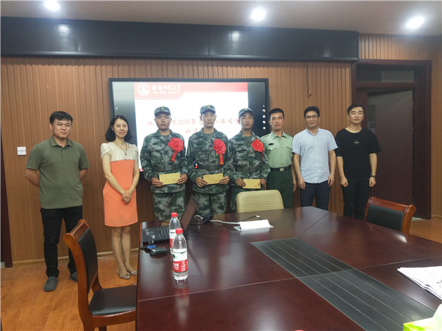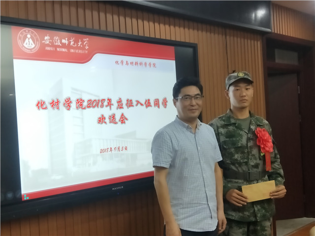 欢送会伊始,学院特邀请2014级材料化学专业退伍复学程才鹏同学与三位参军学子分享参军经验。程才鹏用图片和视频展示了军营的多彩生活,苦与汗,锤炼与成长,是军营的主题曲。程才鹏同学还以自身为例,鼓励三位新兵要怀揣梦想,在军营勇争荣誉。随后,院长高峰叮嘱参军学子,在学校努力做优秀的师大学子,在部队也要肯吃苦,能战斗,为学校学院争取一份荣誉。余妍霞副书记表示,无论何时,学校学院都是你们的家,参军两年后留在部队,学校学院会予以祝福,若回学院继续读书,学校学院会予以最大支持和帮助。最后,高峰院长代表学院向三位入伍同学发放慰问金,三位入伍同学也表达了对学校学院的感谢,他们表示,一定不负厚望,力争做一名优秀的士兵。