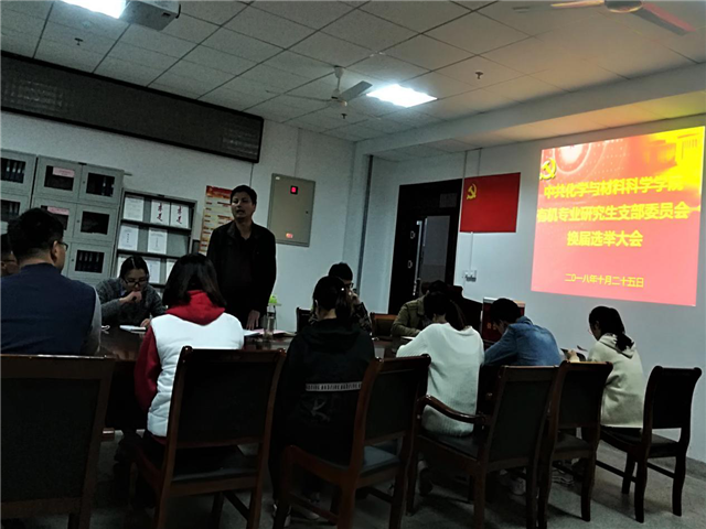 10月25日下午,中共美高梅4858线路登录有机专业研究生党支部委员会换届选举大会在花津校区礼勤楼707会议室举行。支部共27名正式党员,3名预备党员。出席会议的有学院党委委员、副院长周双六,25名正式党员,3名预备党员。会议由支部书记杨培俊主持。