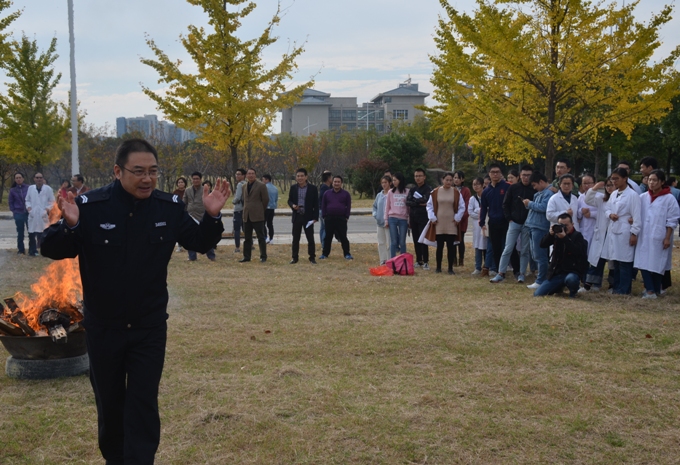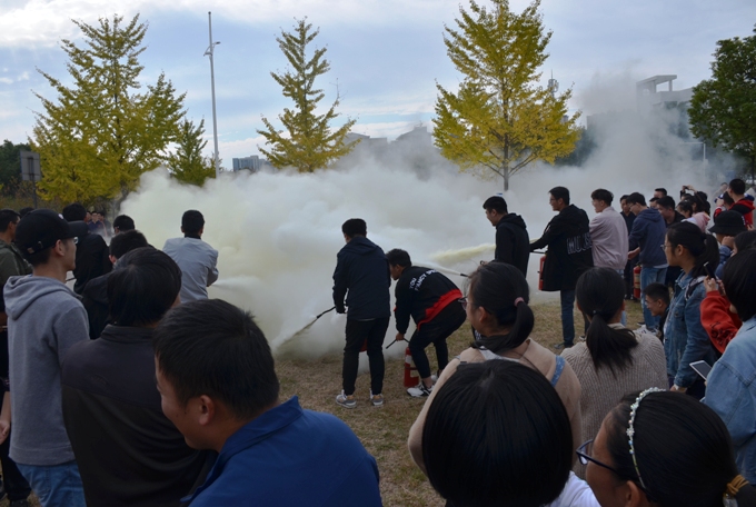 下午2点30分大楼外地震警报器拉响,二楼以上同学就近抱头躲避在桌下或其它坚固的三角位置进行躲避。2点35分大楼外燃起烟幕弹室内火情警报器拉响,同学们用湿毛巾或纸巾捂住口鼻在老师带领下顺着大楼安全通道弯腰低行有序疏散至大楼外。在演练过程中楼内疏散人员能服从指挥按照预先的消防疏散路线疏散学生和实施防震避险,确保证学生安全有序疏散至大楼外,疏散出大楼后同学们集中到物电学院大门外南面空场处进行手持灭火器现场使用讲解及灭火演习,校保卫处处长结合现场燃起的火堆细致讲了解灭火器的使用方法,并让同学们亲自体验了一次灭火器扑灭明火的实战。