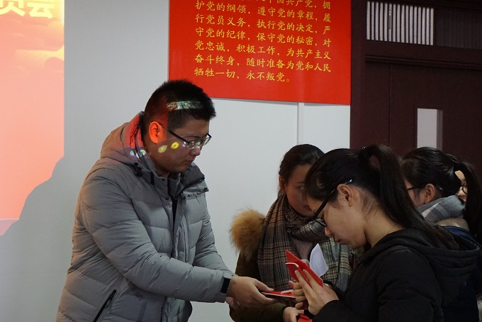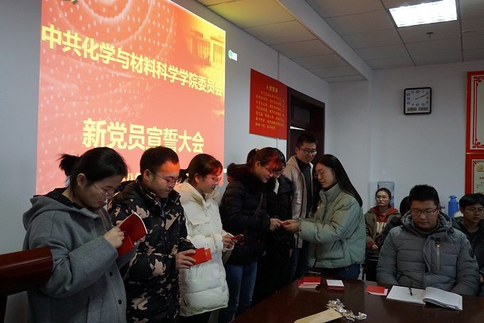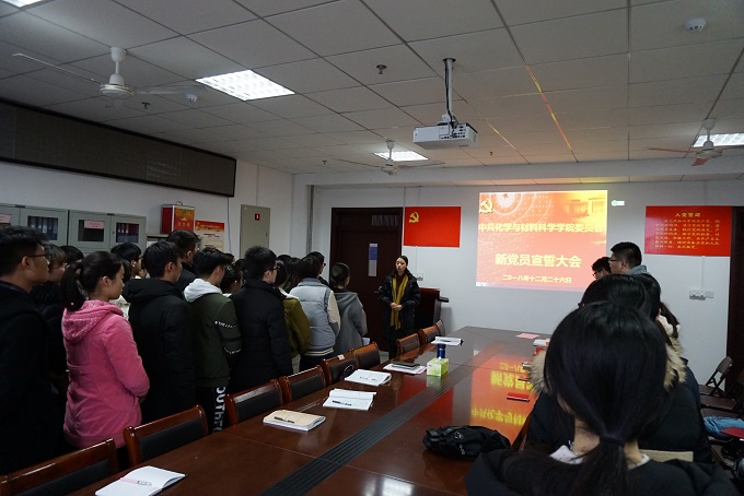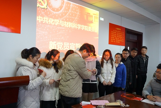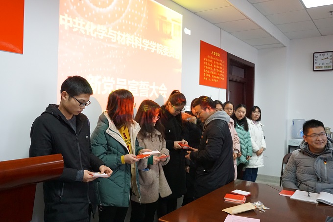 首先,全体起立,奏唱《中华人民共和国国歌》,学院党委副书记余妍霞代表学院党委宣读了同意47位同志发展为中共预备党员的决定。党支部书记向新党员佩戴党徽、发放《党章》和《党费证》。新发展党员现场关注了共产党员、安徽先锋网、安徽纪检监察等公众微信号。全体党员在材化系本科生党支部书记陈露老师的带领下进行入党宣誓:“我志愿加入中国共产党,拥护党的纲领,遵守党的章程,履行党员义务,执行党的决定,严守党的纪律,保守党的秘密,对党忠诚,积极工作,为共产主义奋斗终身,随时准备为党和人民牺牲一切,永不叛党。” 宣誓过程庄严凝重,全体党员声声震彻的入党誓词代表了他们对党最忠诚的决心。新党员代表杨帆做了表态发言,决心在今后的工作中将始终牢记自己是一名共产党员,用自己的实际行动和人格力量,践行社会主义核心价值观,做履职尽责的合格党员,为党旗增辉。