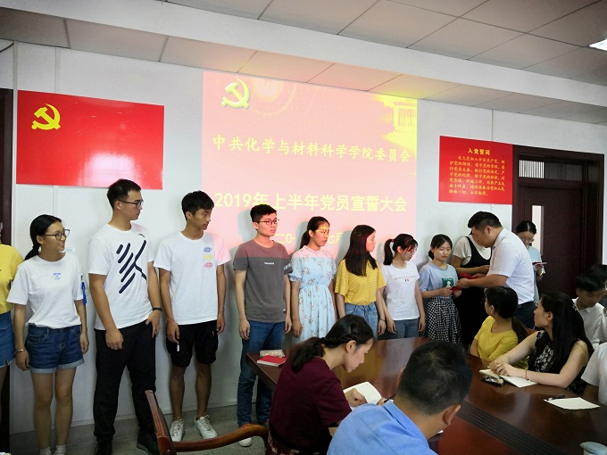 接着学院党委委员、副院长王波涛宣读了学院党委文件《关于2019年上半年党员发展、转正工作的批复》(2019[11]文件),向新发展的59名党员表示祝贺。会上学院党委委员、支部书记向新党员颁发了《中国共产党章程》,佩戴了党员徽章。全体党员在材化系本科生党支部书记陈露的带领下,在鲜红的党旗面前举起右手庄严宣誓,表达对共产主义事业奋斗终身的决心。余妍霞深情嘱咐新党员:希望他们牢记共产党人的初心和使命,坚定理想信念,增强党性修养,加强学习,成才报国,努力为党旗增辉,为中华民族伟大复兴发挥先锋模范作用。