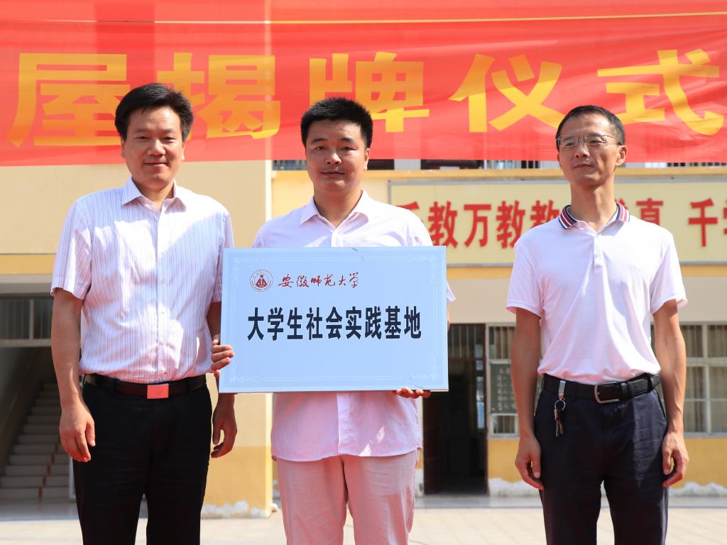 本网讯(美高梅4858线路登录 陶勇)筑梦青春三下乡,爱心服务在路上。7月15日,安徽师范大学党委常委、副校长毕明福赴阜阳市颖东区新乌江镇亲切慰问美高梅4858线路登录大学生暑期社会实践师生,并为大学生社会实践基地揭牌。颍东区教育局局长颜明辉,新乌江镇党委书记陈怀友,校团委副书记刘长生,美高梅4858线路登录党委书记汪俊武,美高梅4858线路登录党委副书记余妍霞,新乌江镇中心学校校长宫朋飞等出席仪式。美高梅4858线路登录团委负责人陶勇,实践团队指导教师蒋建伟、团队全体成员及新乌江镇中心学校300多名支教班的学生参加了仪式。仪式由宫朋飞主持。