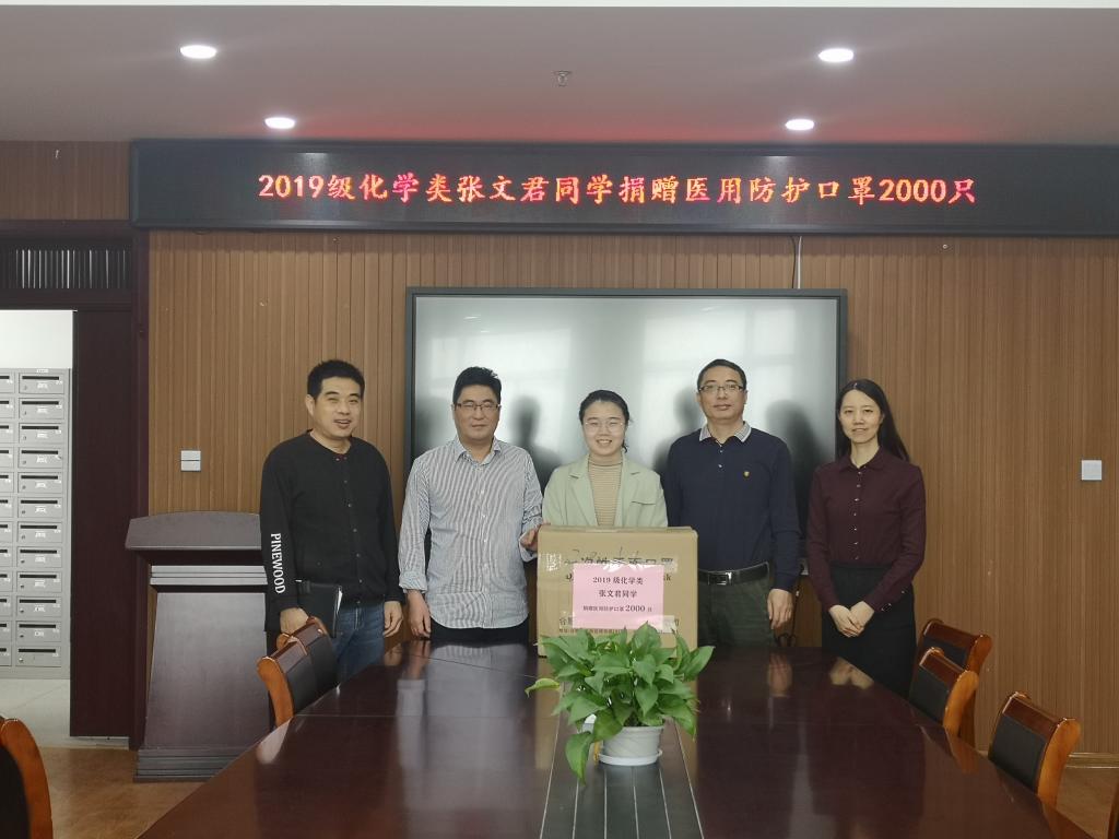 本网讯(化材学院 陈静)5月6日上午,我校化学与材料科学学院2019级化学类专业张文君同学捐赠2000只医用防护口罩(定向化材学院)仪式举行,因校园疫情防控需要,此次捐赠由该生所在班级辅导员陈静老师代为进行,学院领导班子成员现场见证捐赠。