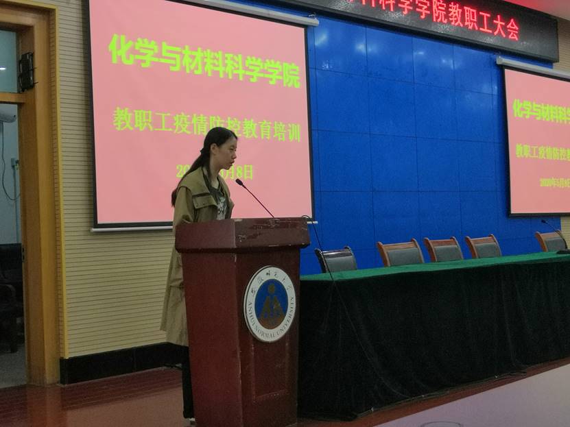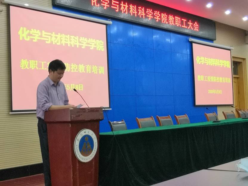 为提高学院疫情防控工作水平和全体教职工疫情防控能力,切实维护师生生命健康和人身安全,进一步加强思想引领,全力保障2020年春季学期开学工作安全有序进行,根据《安徽师范大学疫情防控宣传和健康教育制度》要求,美高梅4858线路登录于5月8日下午组织开展教职工疫情防控教育培训,全体教职工参加了会议。会议由学院党委书记汪俊武主持。