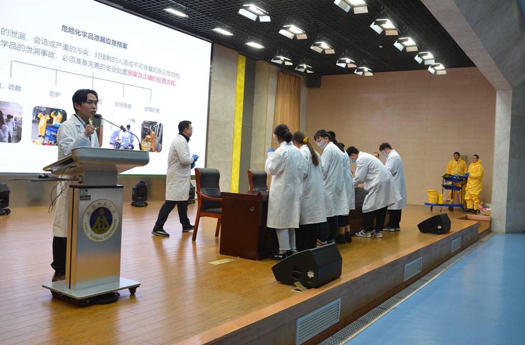 活动开始,翟永志老师从近年来发生的安全事故实例入手,结合高校接连发生的惨烈的实验安全事故,分析导致实验室安全事故的多种因素,指出了构建实验室安全防控保障体系的重要性和必要性。随后,翟老师通过对易燃物、腐蚀性物质等实验室常见危险化学物品进行知识普及,呼吁要培养新的实验室安全价值观。最后,在学院老师和同学的配合下进行现场实操演练,对实验室事故发生的原因、进展的过程、处置的结果等进行了情景再现,并由翟老师一一讲解每一环节的注意事项和正确处理方式。