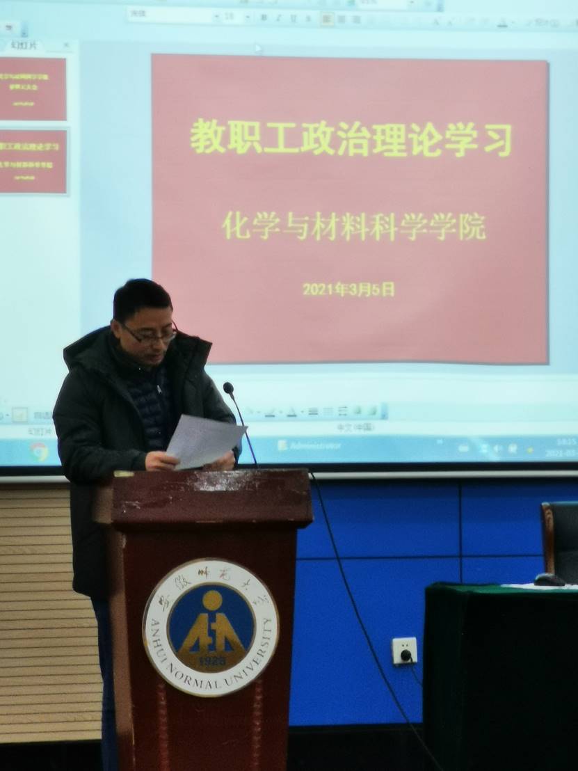 3月5日下午,美高梅4858线路登录召开新学期首次教职工大会,集中学习全国两会精神,学习习近平总书记在党史学习教育动员大会上的重要讲话精神。学院领导班子成员及全体教职工参加了会议,会议由学院党委书记汪俊武主持。
