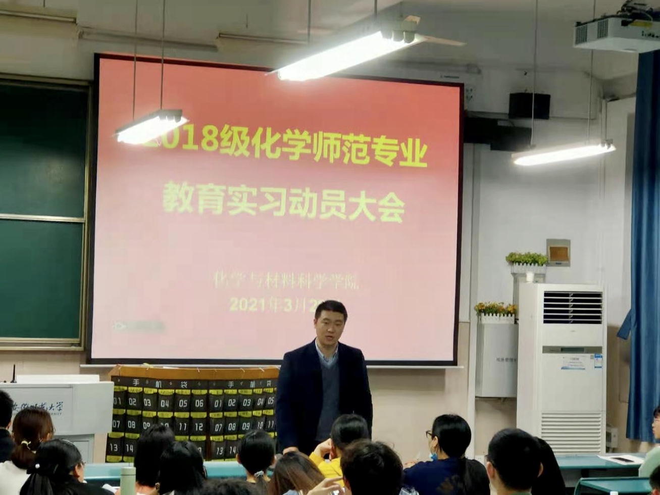 本网讯(美高梅4858线路登录 信欣)为做好师范专业教育实习工作,提升师范生实习技能,3月26号晚,美高梅4858线路登录2018级化学(师范)专业教育实习动员大会在花津校区2020103教室举行。美高梅4858线路登录党委副书记李古州、副院长方臻、教育实习指导教师、2018级化学(师范)专业学生以及部分化学教学论专业研究生参加会议。会议由化学系主任阚显文教授主持。