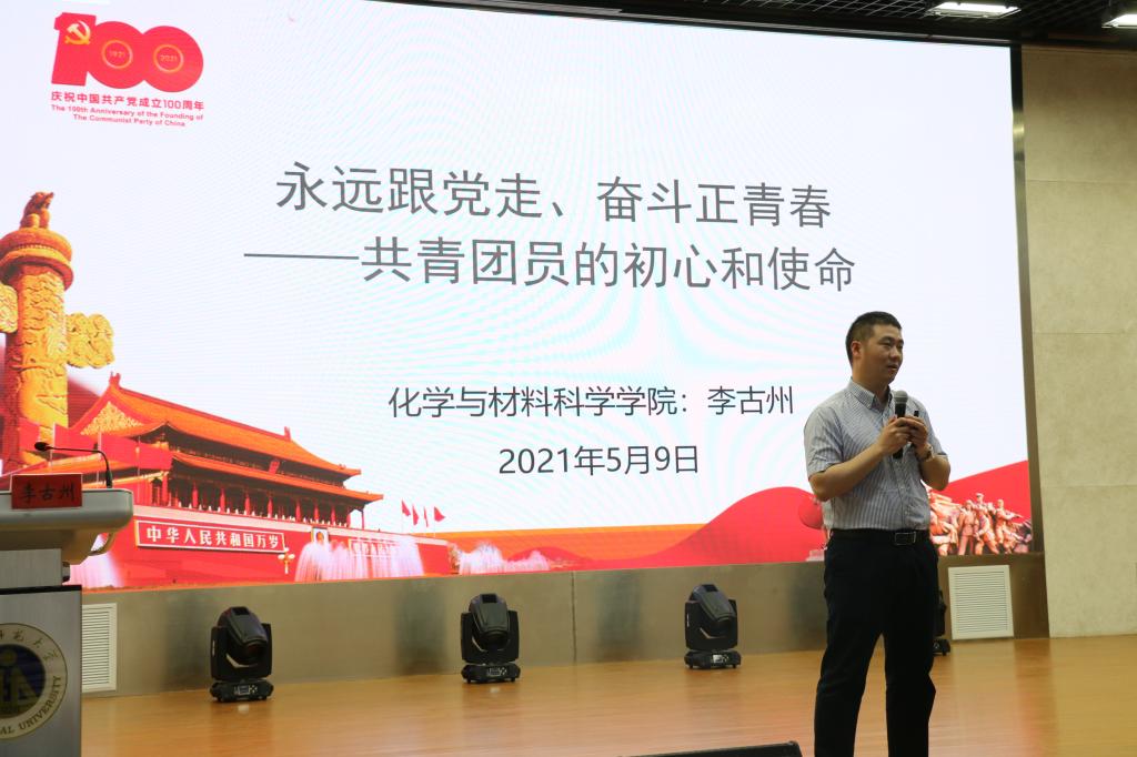 李古州结合学习习近平总书记考察清华大学时的重要讲话精神和安徽省委副书记程丽华在全省“学党史 强信念 跟党走”主题团日活动上的讲话精神,从“共青团的初心和使命、新时代青年的新使命、青年不忘初心跟党走”三个方面,作了题为《永远跟党走 奋斗正青春——共青团员的初心和使命》的主题团课,阐明了坚定不移跟党走就是共青团的初心,为党和人民不懈奋斗就是共青团的使命。报告通过大量事例,引导广大青年学子要认真结合团系统“学党史、强信念、跟党走”学习教育,做一个爱国爱民、锤炼品德、勇于创新、实学实干的人,要用坚定的信仰守护精神的家园、务实的作风锤炼高尚的品德、扎实的学识照亮前行的道路、勤劳的双手创造美好的未来,争做一名优秀的青年大学生。