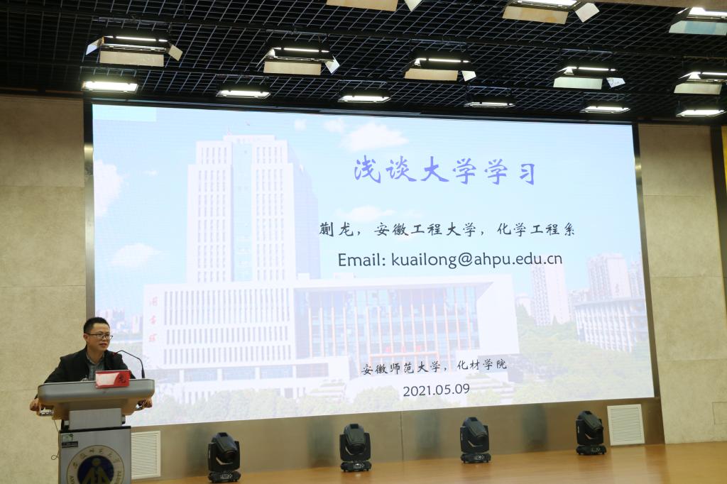 第七届“中国青少年科技创新奖”获得者、安徽工程大学蒯龙老师为全体同学作了题为《浅谈大学学习》的报告,讲述了自己从一名学生到成长为一名高校教师的学习科研经历,并结合工作的感悟,从学习驱动力的角度阐述为什么学的问题,从学习内容的角度解答学什么的问题,从学习方法和要求的角度回应怎么学的问题,引导青年学子要珍惜大学生活、认真踏实学习、规划四年目标,走好大学生活每一步。