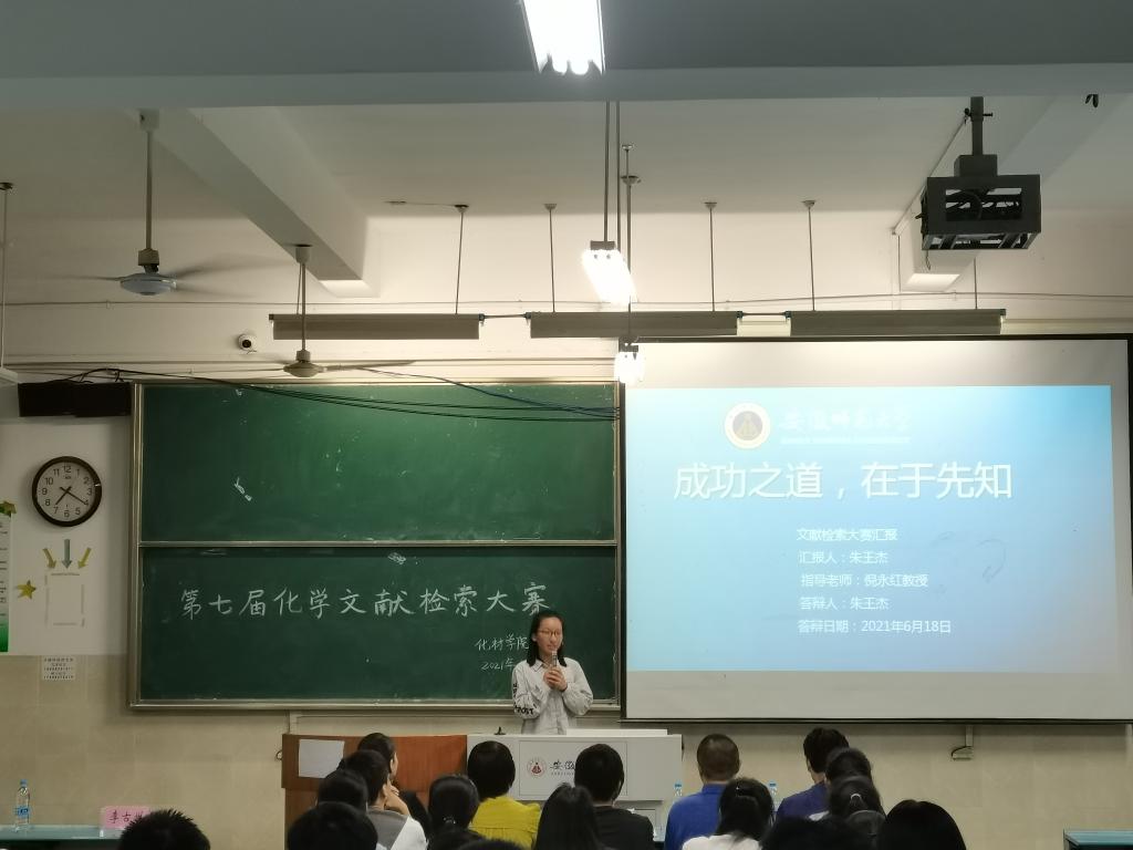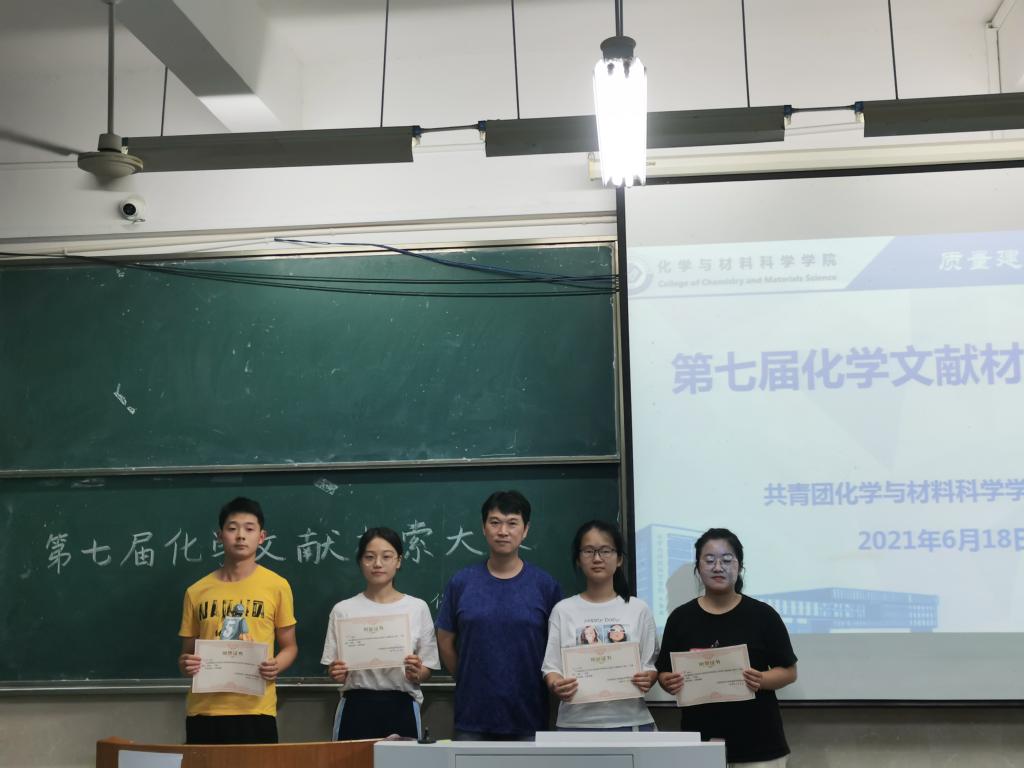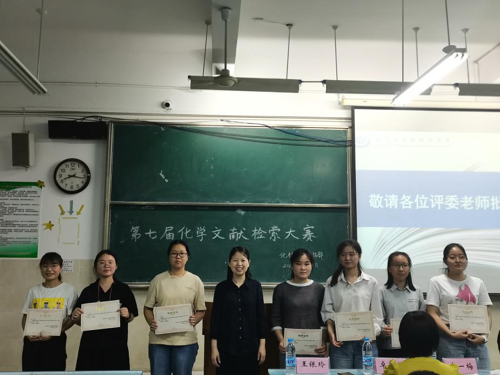 比赛中,七组参赛选手依次上台进行汇报,各组参赛选手分别结合了自身大创实验课题,对化学文献检索的基本知识、基本工具、基本方法、基本过程等进行了详细的介绍,生动地展示了掌握化学文献检索技能的重要性。每组选手汇报结束后,由评委老师根据各组汇报内容进行提问、指出不足之处、提供指导意见并打分。大赛期间,在主持人的主持下,进行了互动环节,在场学生积极举手,踊跃回答,现场气氛活跃。评委老师还为获奖选手颁奖并合影留念。