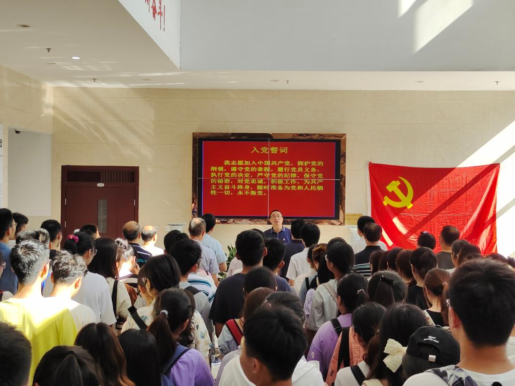 高峰宣读了学院党委《关于批准杨婉妮等84位同志为中共预备党员的批复》,并对他们加入党组织表示祝贺。老党员给新发展的党员颁发了《中国共产党章程》和党费证,并佩戴党员徽章。随后,全体党员握拳过肩,面向鲜红的党旗,在领誓人的带领下,庄严宣誓。党员们情绪饱满,字字铿锵,在激昂的宣誓声中,每位党员都接受了一次深刻的思想洗礼,进一步强化了对党忠诚、全心全意为人民服务的使命意识。