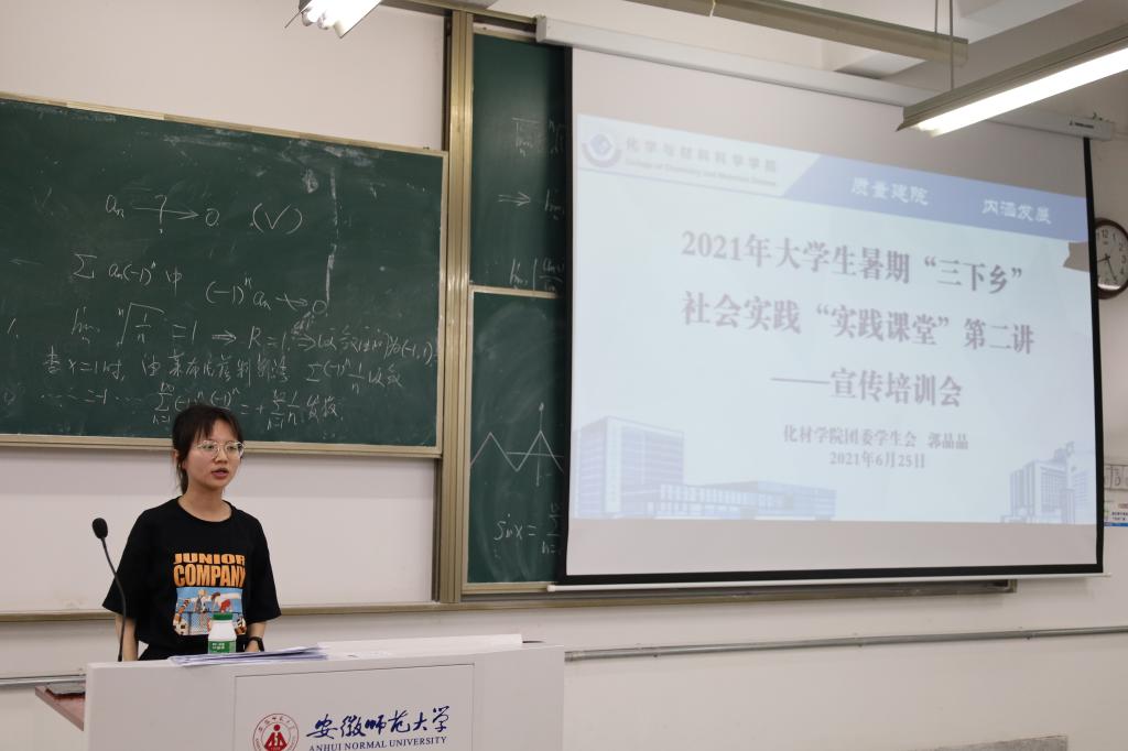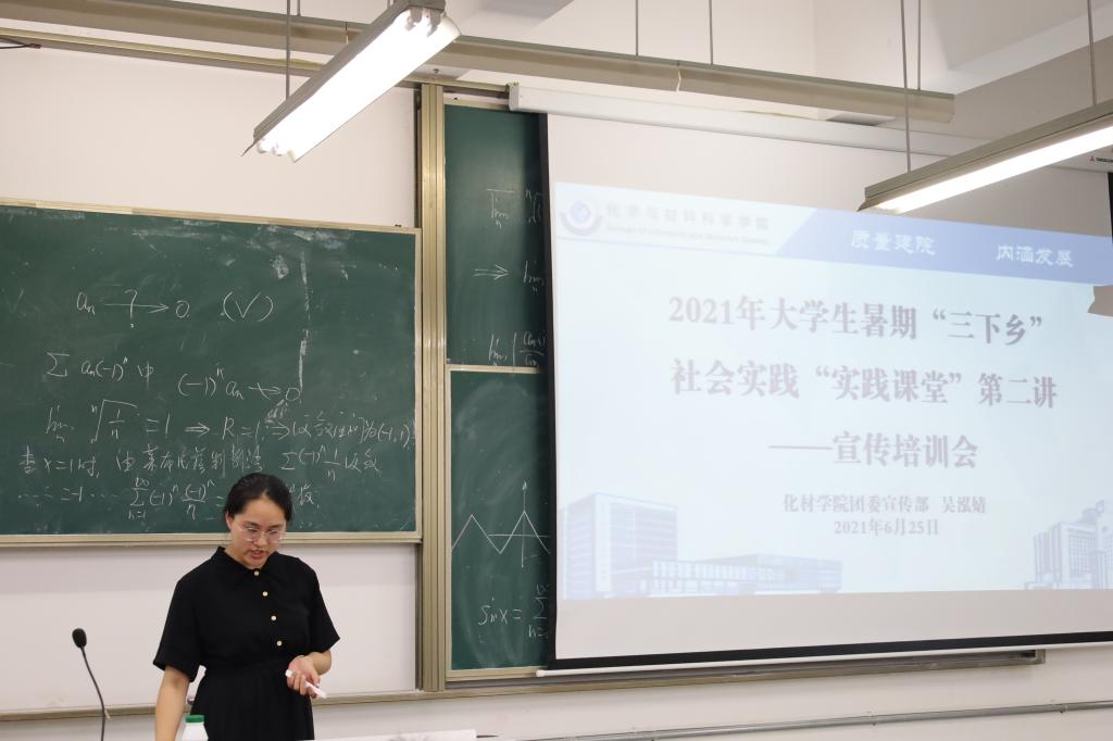 陶勇老师首先介绍了开展暑期社会实践活动的意义,结合往年宣传经验、通讯稿投稿量和新媒体平台运营情况,强调了宣传工作在暑期社会实践活动中的重要性。随后,学院学生会主席、2020年暑期社会实践优秀个人郭晶晶同各队宣传员分享了通讯稿的投稿经验,并介绍了投稿所需的注意事项。团委宣传部部长吴泓婧则从新闻稿的撰写入手,将通讯稿的文字撰写、图片拍摄和格式要求进行了说明。团委宣传委员汪佳和团委宣传部副部长薛源介绍了QQ、微信两大新媒体平台的运营方法,并详细介绍了说说图文动态、微信公众号推文的制作方法。与此同时,此次培训会也向各队宣传员公布了校级重点团队、院级重点团队和班级团队的宣传指标,并布置了实践过程中宣传日报的具体工作时段和工作要求。