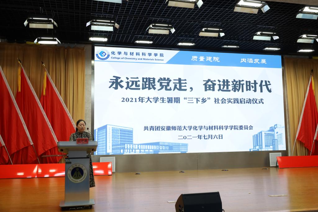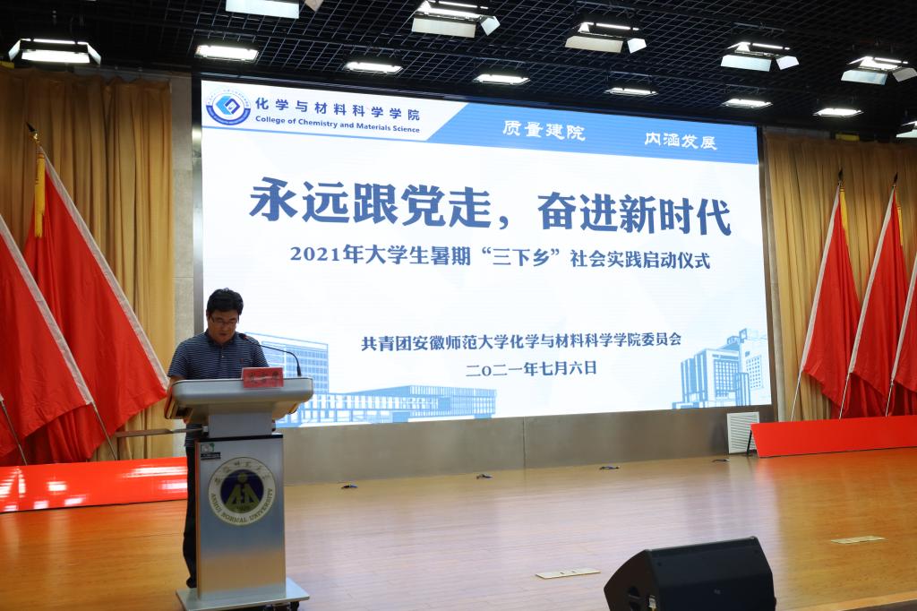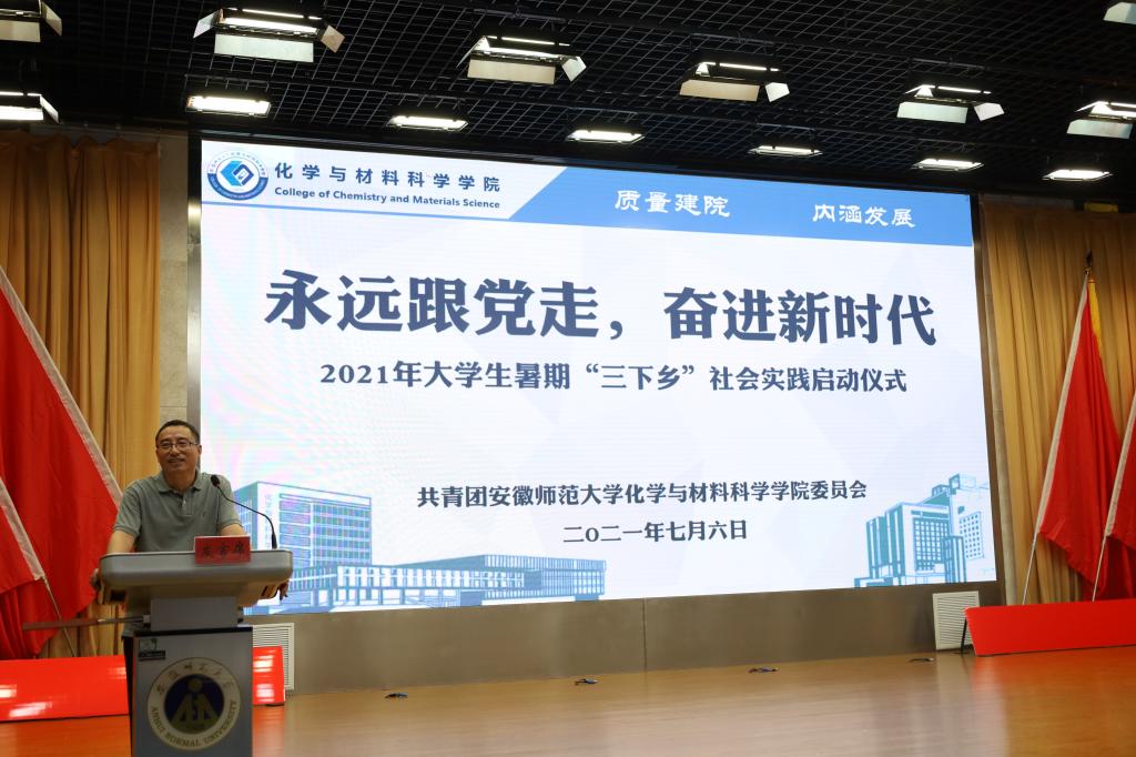 汪俊武做社会实践出征动员讲话。他指出,大学生暑期社会实践活动是落实习近平总书记关于青年成长成才重要讲话精神的具体举措,是加强和改进高校思想政治教育的重要途径,是大学生增长才干、奉献自我、服务社会的有效载体,在引导青年学生了解社会、认识国情、拓展视野、砥砺品格,增强社会责任感等方面都具有不可替代的作用,希望广大青年学子要强化学习意识,通过社会实践的大舞台将自己所学理论知识与社会实践活动有机结合;要强化纪律意识,在实践活动中严守组织纪律观念,发扬团队精神;要强化安全意识,增强安全防范意识和自我保护能力。在建党100周年来临之际,我们要结合暑期社会实践学党史、悟思想,切实用专业所学、青春才干担当民族复兴大任,躬身实践,办实事、开新局,为全面建设社会主义现代化国家贡献化材学子的青春力量。