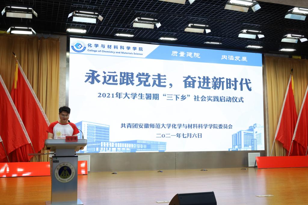 2019级化学师范专业章志诚同学作为队员代表进行发言,他表示作为当代青年大学生,在努力学习专业知识的同时,也应主动寻找机会为社会尽责,积极投身社会实践,磨练自身的意志,丰富自己的实践经验。
