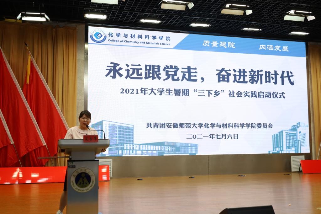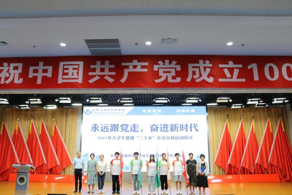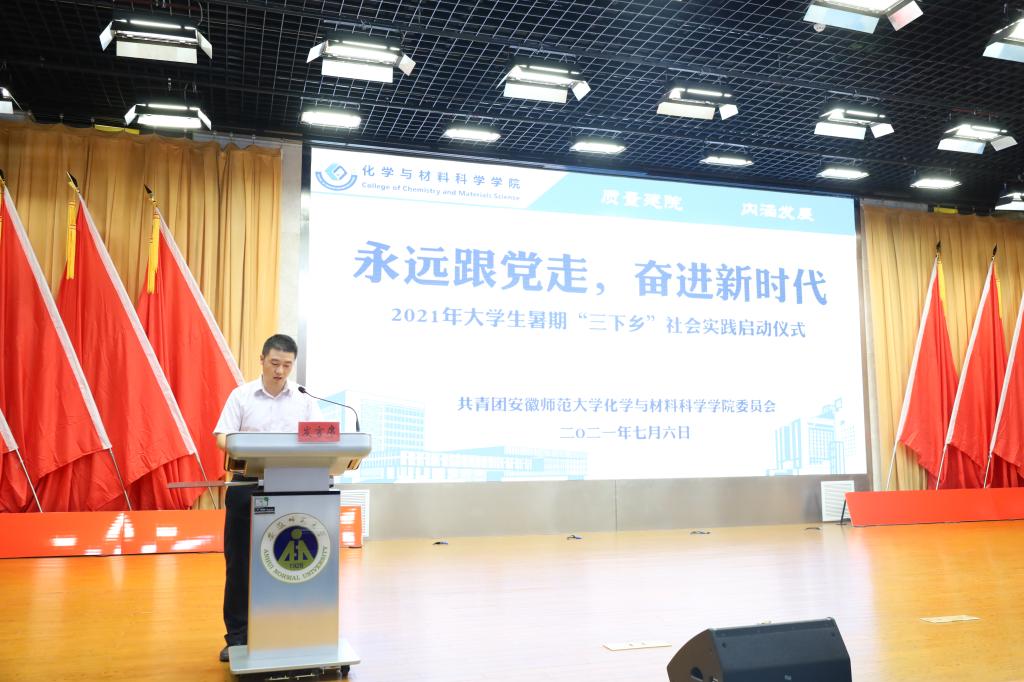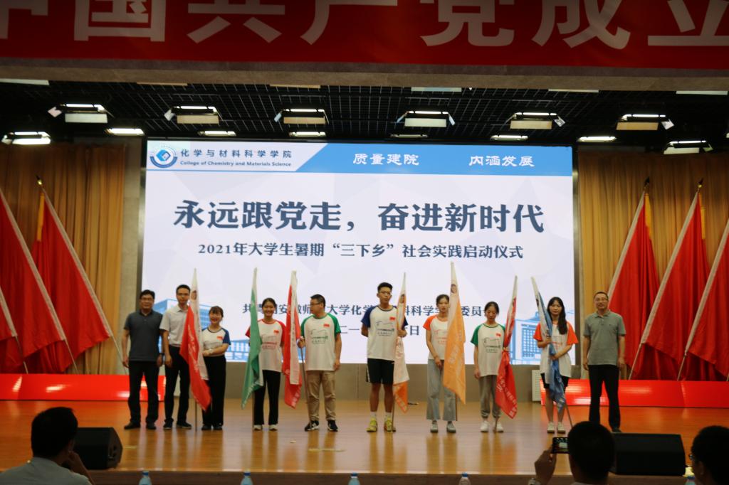 本网讯(美高梅4858线路登录 陶勇)为深入学习贯彻习近平新时代中国特色社会主义思想,引导和帮助广大青年学生上好与现实相结合的“大思政课”,在社会课堂中受教育、长才干、作贡献,以实际行动庆祝中国共产党成立100周年,美高梅4858线路登录于7月6日下午15:00在理科大楼报告厅举行了2021年大学生暑期“三下乡”社会实践活动启动仪式暨授旗仪式。校团委书记汪凯、校思政课指导老师温建萍、院党委书记汪俊武、院长高峰、党委副书记李古州,副院长周双六、方臻、王波涛,系主任阙荣辉、黄玉成、周映华、指导老师代表以及学院2021年暑期社会实践全体队员参加仪式。本次会议由学院团委书记陶勇主持。