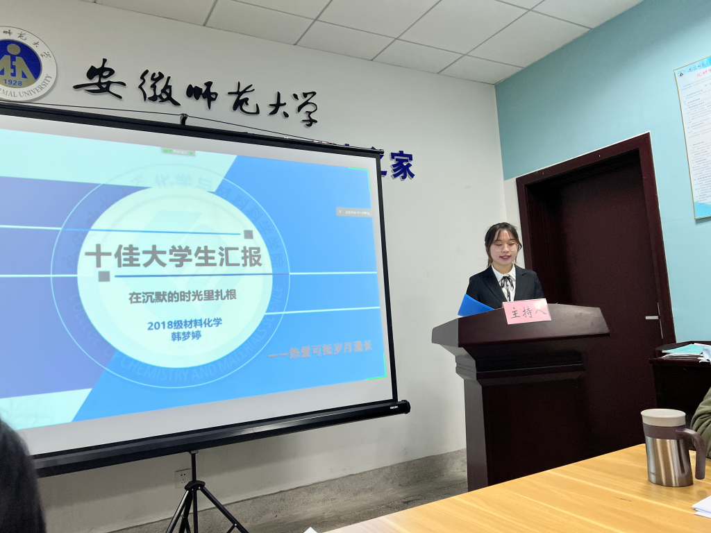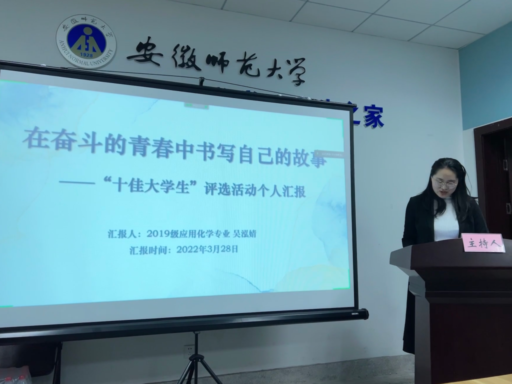 学生通过个人申报,班级评选,最终进入院级“十佳大学生”评选汇报会。他们精心准备,用PPT分别从智育成绩、志愿服务、社会实践、科研工作等方面进行展示,充分体现了“十佳大学生”优异的并不只是成绩,更是在日常校园生活以及社会实践等各个方面有着优异表现。他们之中不乏有苦心钻研学术,致力于在专业领域中展现出自己的一番风采;或是热心公益,期盼在奉献之中寻找到自身的人身价值;亦或是投身于社会实践,在切身的实践中领悟应承担的社会责任。