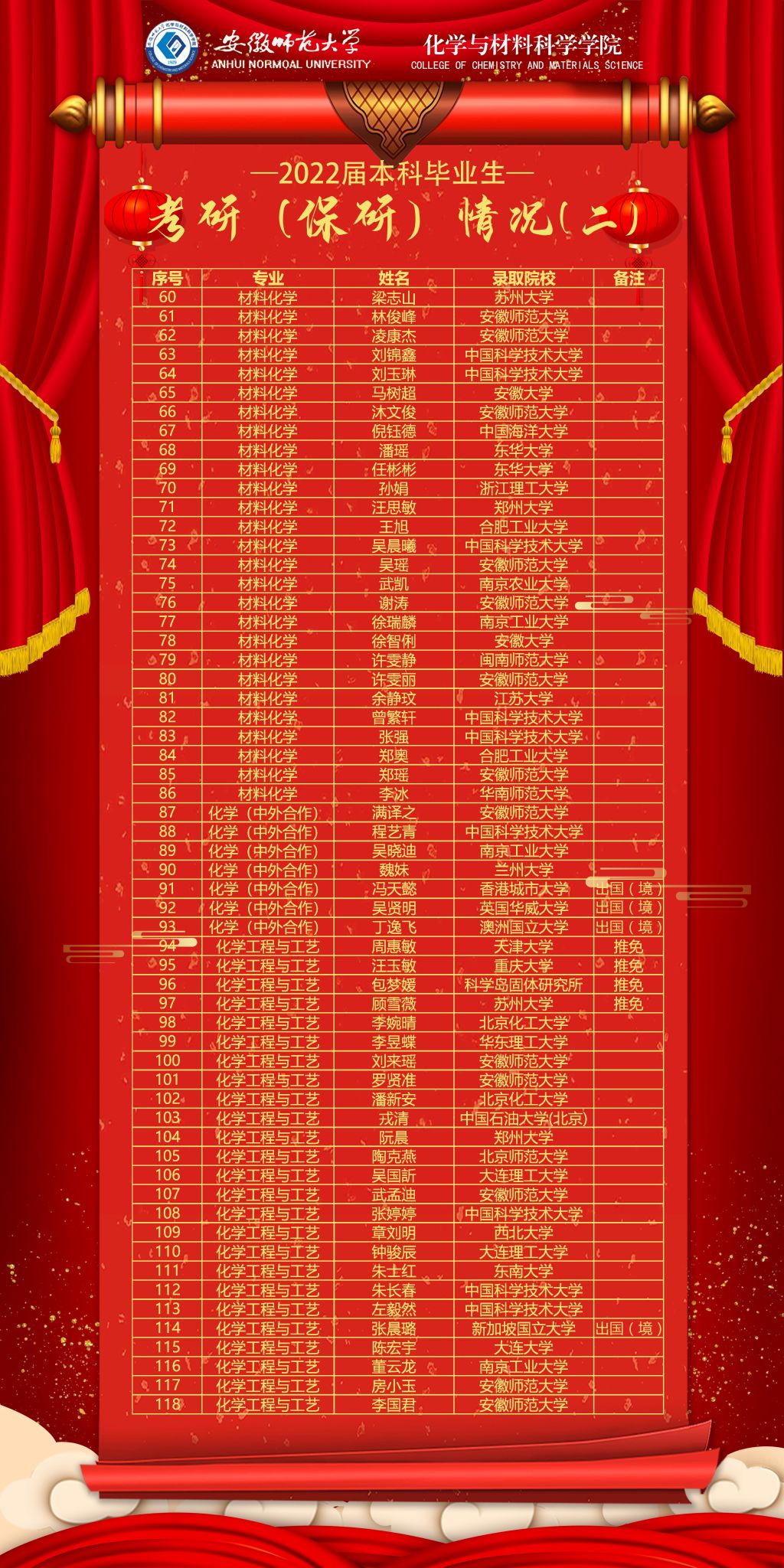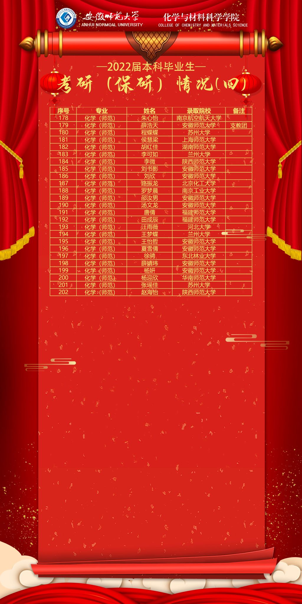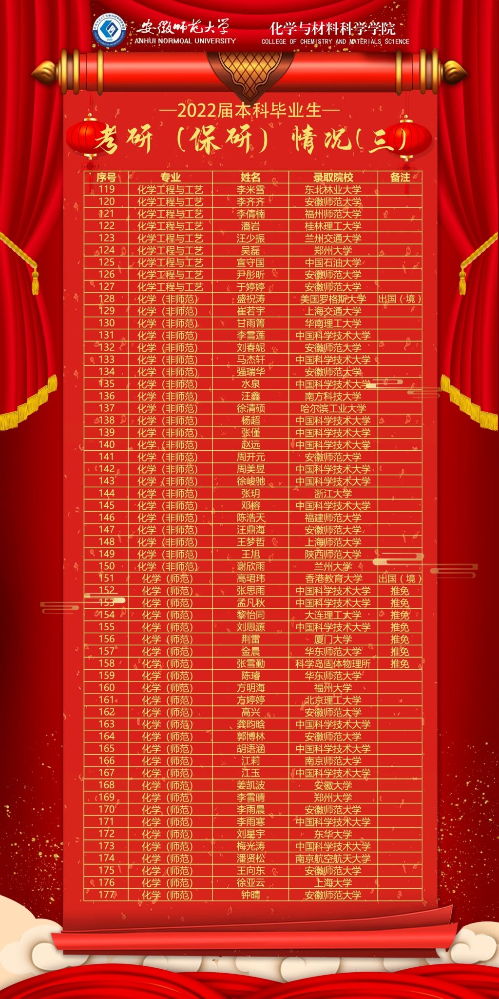 化学(非师范)专业、化学(师范)专业(12#221):化学(非师范)专业赵远考研至中国科学技术大学、崔若宇考研至上海交通大学;化学(师范)专业方明海考研至福州大学,郭博林考研至安徽师范大学。