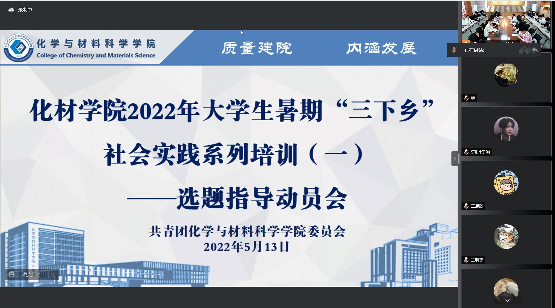 陶勇就今年社会实践整体安排、往年实践活动开展情况和实践选题建议三个方面对2022年暑期社会实践活动进行了详细介绍和解读,希望同学们结合党的二十大及建团一百周年等主题开展志愿服务和调研工作,注重体现时代特点、专业特色和当地需求。同时,他还从先锋化材、学术化材、创新化材、奉献化材四个大类为同学们做了具体介绍。随后,于洪翔、付娜、王芳老师分别就实践团队选题方向和注意事项提供了详细介绍和建议,期望大家认真对待暑期实践,积极参与,合理规划,各位老师详尽的介绍使各类团队就后期工作开展明确了方向。
