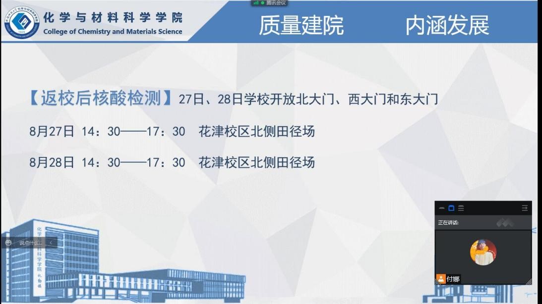 学院积极落实学校疫情防控常态化的相关要求,辅导员通过召开主题班会、走访寝室等形式,提高学生对“每个个体都是疫情防控第一责任人”的高度重视。坚持落实“今日校园”每日健康打卡制度,组织做好学生开学返校信息登记、全员核酸检测,严格执行学生缺课、缺勤“零报告”和校园出入信息登记、离芜审批等相关制度,切实维护疫情防控常态化下校园稳定和学生安全。