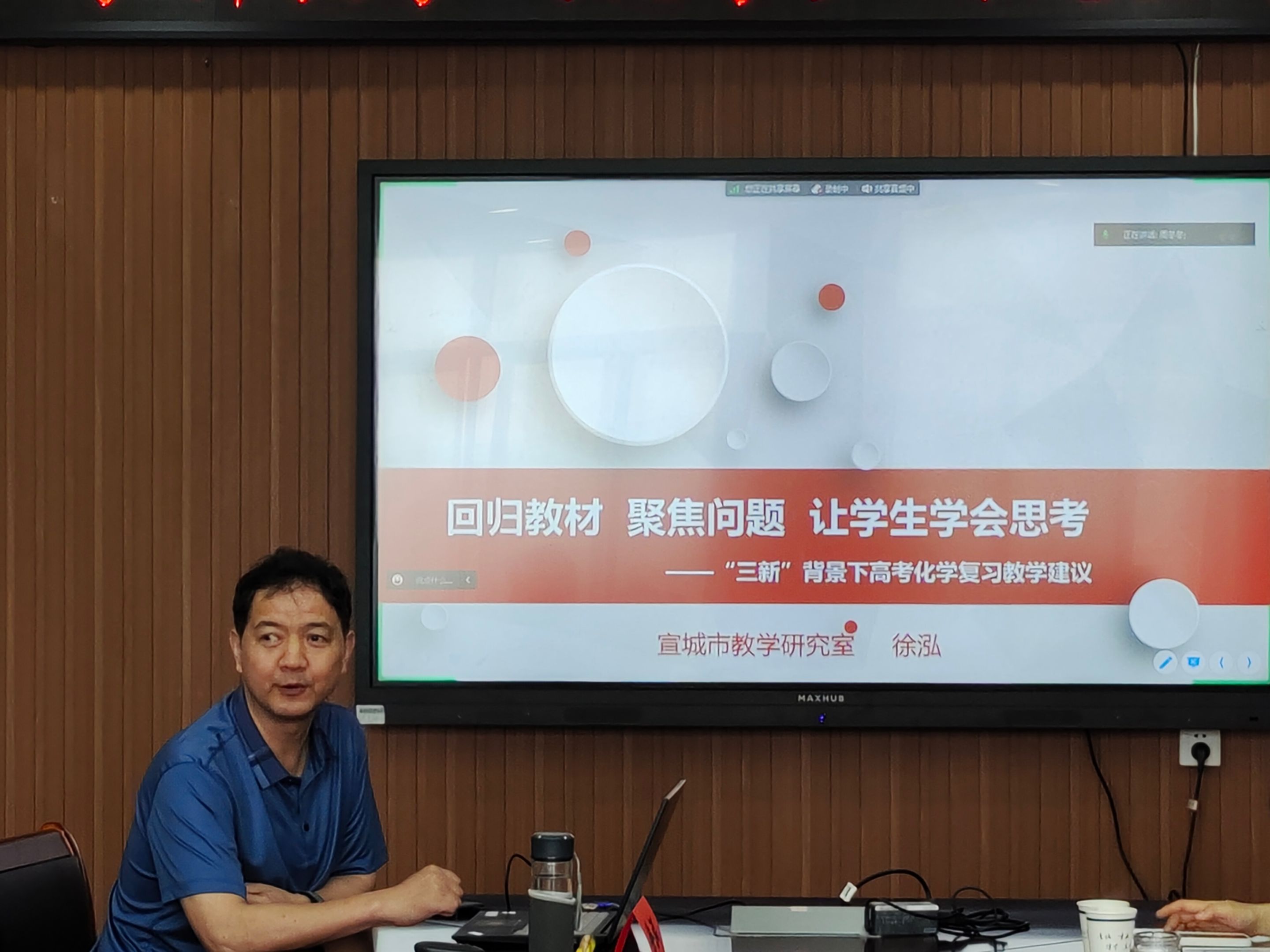 徐泓开展了题为《回归教材聚焦问题让学生学会思考》的报告,引导同学们从课堂中存在的问题出发,结合典型的高考试题,强调在教学过程中要回归教材,不能只着眼于教辅,并提出了三点建议与要求:其一回归教材,夯实必备知识;其二聚焦问题,提升关键能力;其三灵活应对,优化思维品质。强调在教学过程中要“以考定教”,不能脱离教材,充分发挥教材的作用。