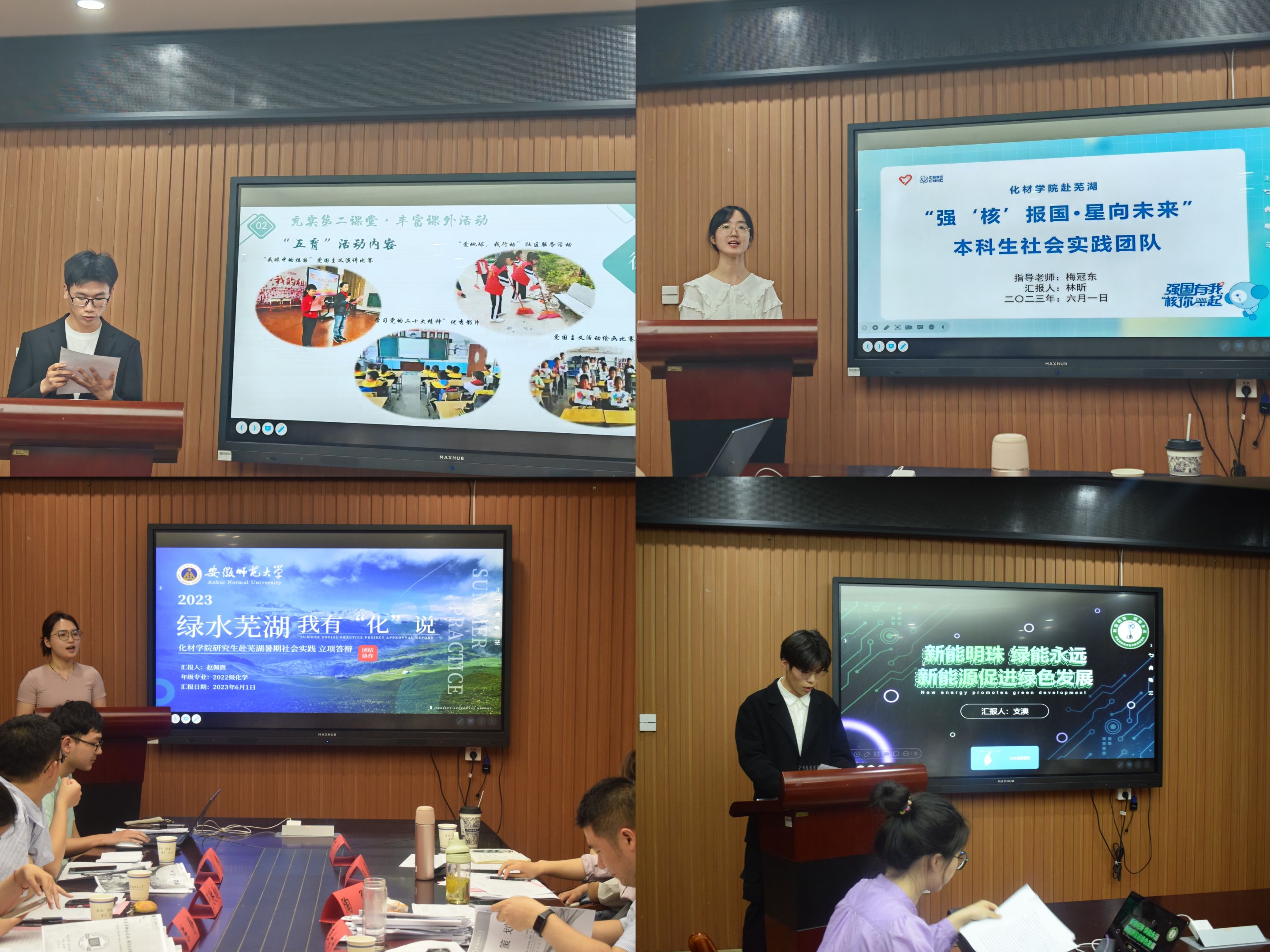 本次答辩会共有29支团队参与,根据实践主题分为先锋化材、奉献化材、学术化材、创新化材。各团队选题丰富,涵盖红色宣讲、科普支教、社会调研、乡村振兴、水质调研等多个层面,并结合国情和新出台的相关政策,关注时下热点问题,策划了一系列的实践活动。每个团队均有对应的指导老师,为实践活动的开展提供意见。答辩会上,29名学生代表分别就各自实践团队项目进行了展示和讲解,他们分别从不同的角度出发,运用不同的方法,介绍各自团队的实践方案。其中,“绿水芜湖,我有‘化’说”社会实践团从实践地的实际情况出发,分析了芜湖当地生态环境保护存在的问题,并提出了可行性建议;“守艺·创新”大学生非遗调研团队成员从文化遗产保护角度出发,在实地考察和文献资料收集的基础上,对当地的文化遗产保护方案进行了系统性的梳理并提出合理化建议;美高梅4858线路登录赴芜湖返乡创业现状及存在问题调研团队成员陈志立从当地经济社会发展角度出发,基于数据分析和问卷调查情况,发现大学生返乡创业存在的问题,并提出了自己的见解和解决方案。入围团中央专项团队的美高梅4858线路登录赴芜湖“强‘核’有我,星向未来”本科生社会实践团队成员就“核科普宣讲”筹备、行动、预算等方面分析“两弹一星”精神的主题优势,介绍团队实践内容,以大学生团体和中小学为主体进行科普宣讲,深入社区科普“两弹一星”精神和绿色核能发展理念,努力在青春的浪潮不断翻腾的今天,将“两弹一星”精神、核工业精神和绿色核能发展理念宣扬到更基层,更深处,将“强国复兴有我”这一理念植入当代人民的内心深处,深刻感悟党和国家发展的伟大成就,引领号召青年们创新奉献,投入祖国的建设当中。
