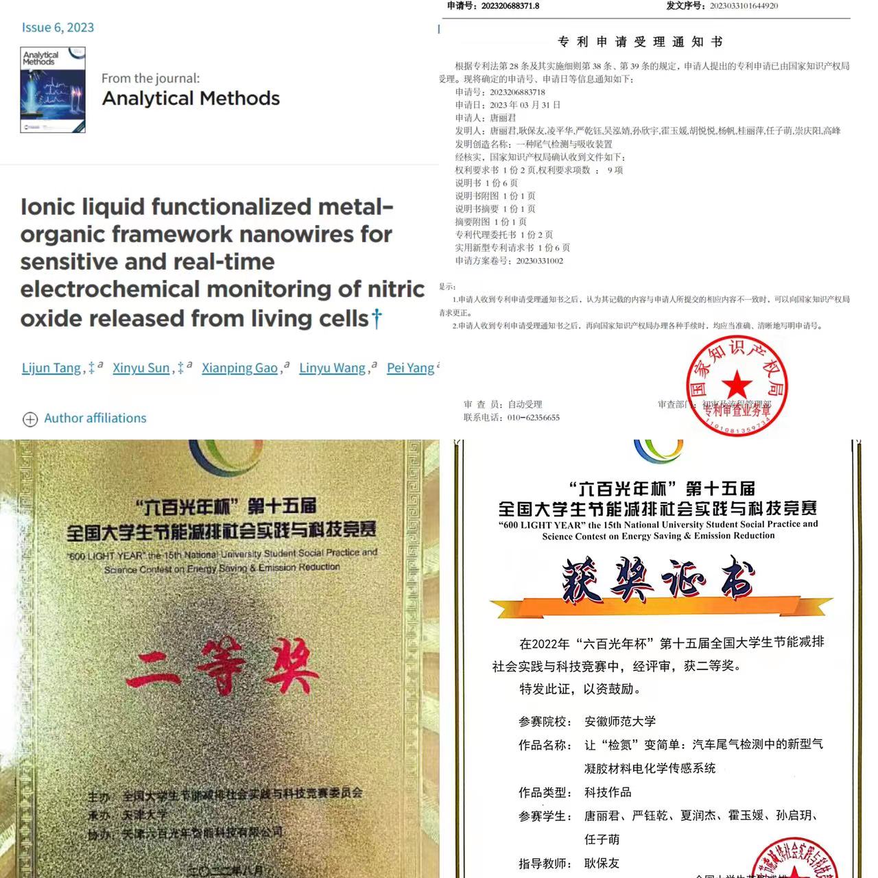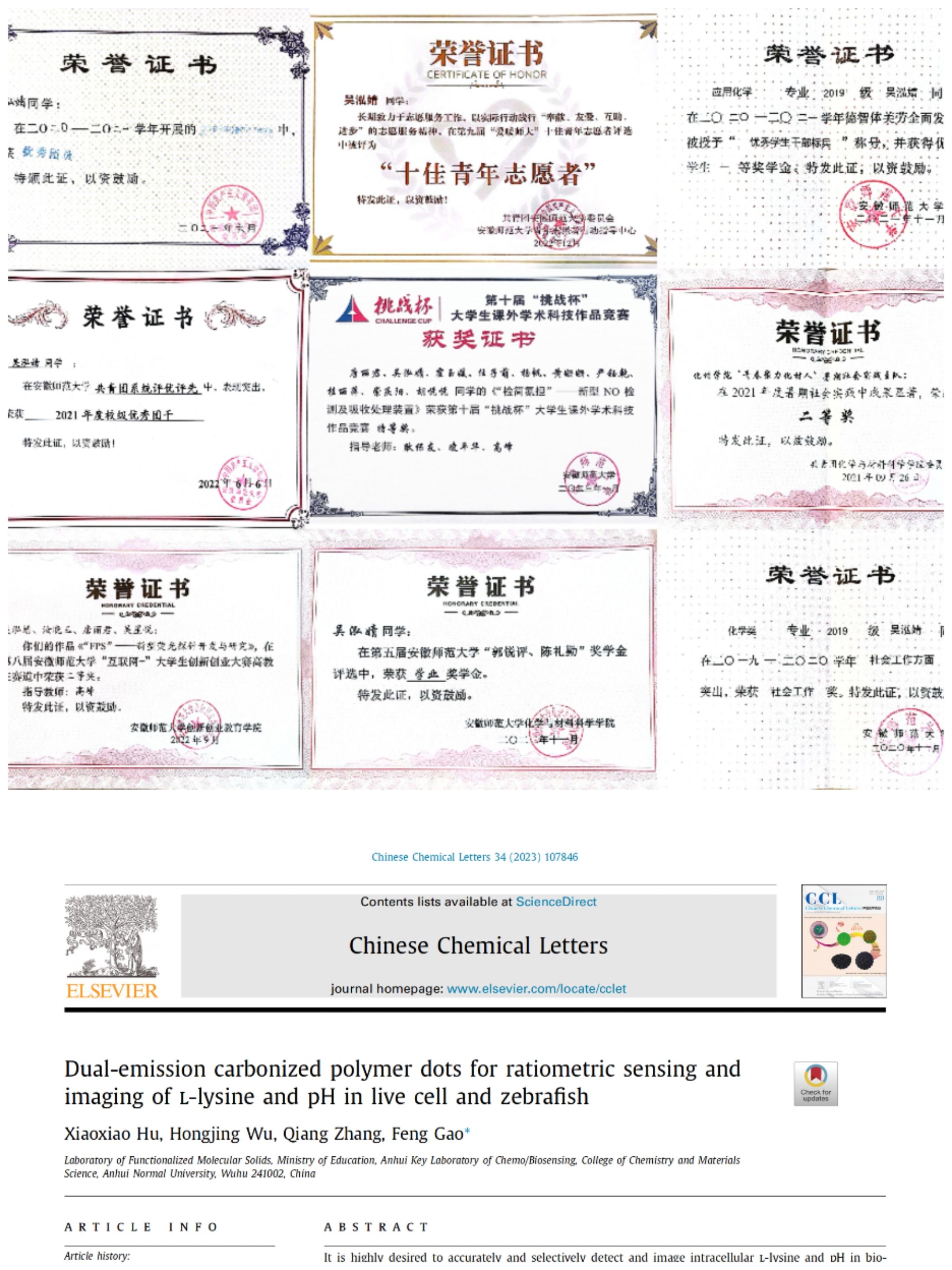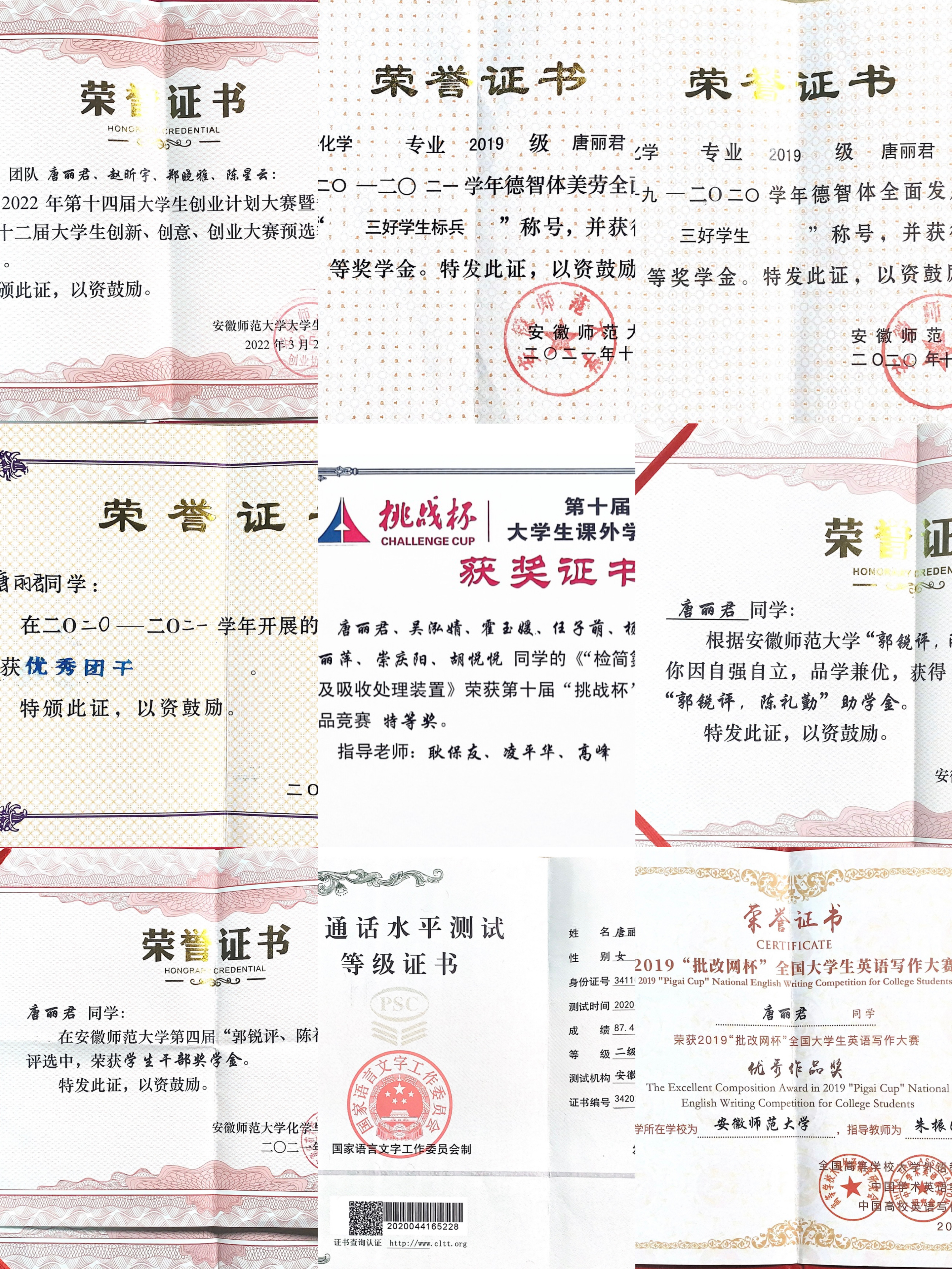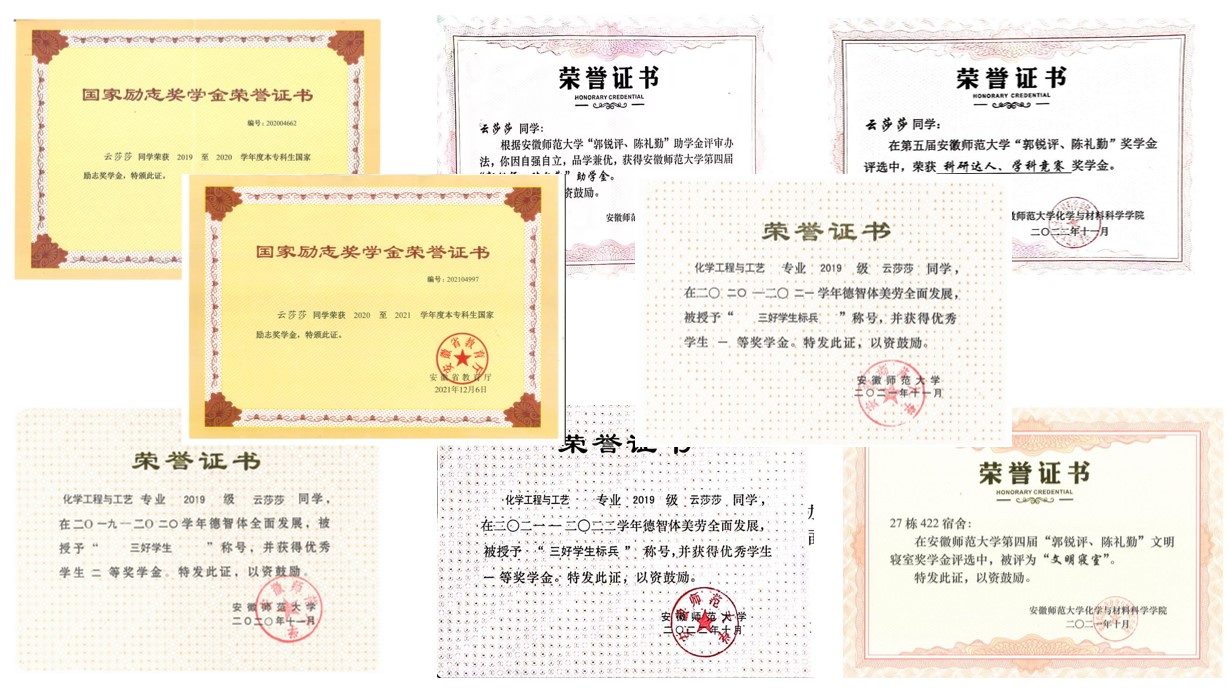 她勤学慎思,成绩优异,连续四年获校优秀学生奖学金、校优秀学生干部、优秀团员等荣誉称号。在大二学年她受邀进入导师课题组深入学习,参与国家级大学生创新创业训练项目和本科生优秀毕业论文培育项目,现已发表SCI论文1篇,1篇论文在投,1篇专利进入受理阶段,作为团队主要成员参与“挑战杯”大学生课外学术科技作品竞赛并获校级特等奖。现已加入安徽师范大学第25届研究生支教团,推免至本校攻读分析化学方向研究生。
