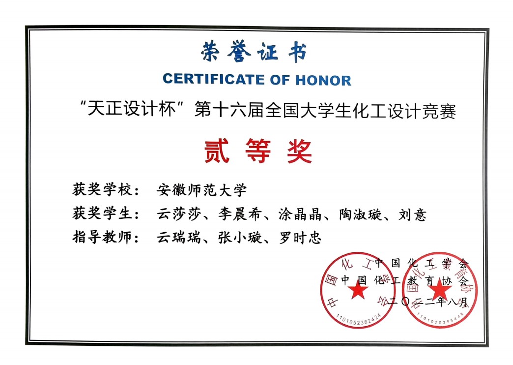 “真理的大海,让未发现的一切事物,躺卧在眼前,任凭去探寻。”大学期间,她先后多次参与各类竞赛活动,积累了丰富的经验。作为项目负责人,所设计的“盛虹炼化(连云港)年产12.5万吨1,4-丁二醇”项目,获第十六届全国大学生化工设计竞赛国家二等奖。她用理论联系实际,关注水质检测,连续两年参加全国大学生市政环境类创新实践能力大赛,获第三届“北控水务杯”中部赛区虚拟仿真赛二等奖、化验赛二等奖。
