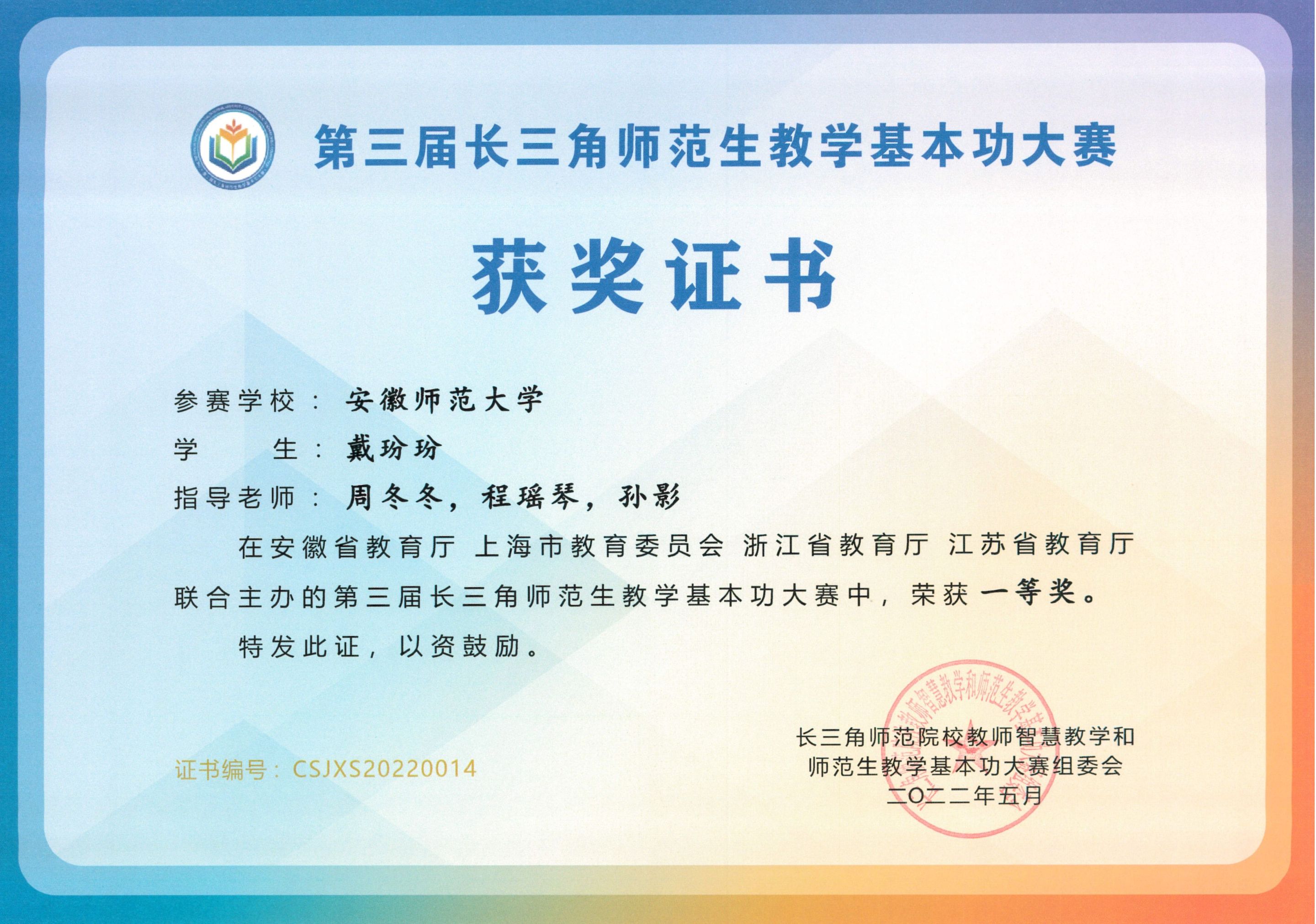 戴玢玢同学秉承着成为优秀化学教师的初心,术业专攻,以行践知,在“田家炳杯”全国师范院校师范生教学技能竞赛中获二等奖,在四省联合举办的长三角师范生教学基本功大赛中获一等奖和二等奖,在安徽省赛中获二等奖,连续两次获安徽师范大学校级师范生技能大赛一等奖,以积极昂扬的精神风貌投身到学科竞赛中。