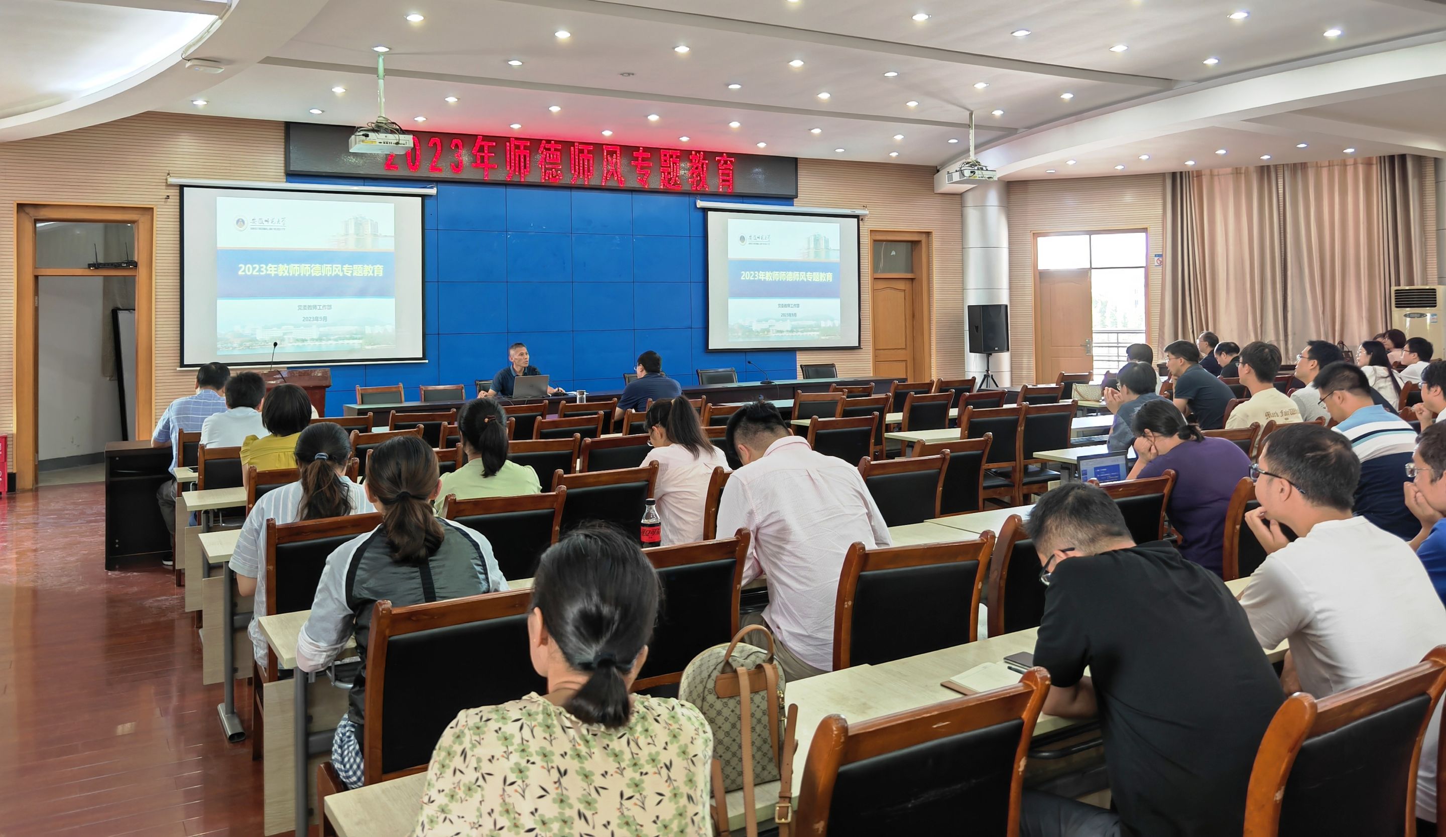 梁齐军首先带领大家认真学习习近平总书记关于师德师风建设的重要论述以及中央、省委关于师德师风建设的相关文件精神,重点介绍了学校师德师风建设的相关举措、存在问题、相关法规制度、负面案例以及违纪处理等基本情况。他希望广大教职工要认真学习领会习近平总书记关于师德师风的重要指示精神。师德师风决定了教师的素质,教师的素质又决定了教育的质量,因此,每位教师都要充分认识到师德师风建设的重要性,自觉提升师德师风水平,推动高校高质量发展。