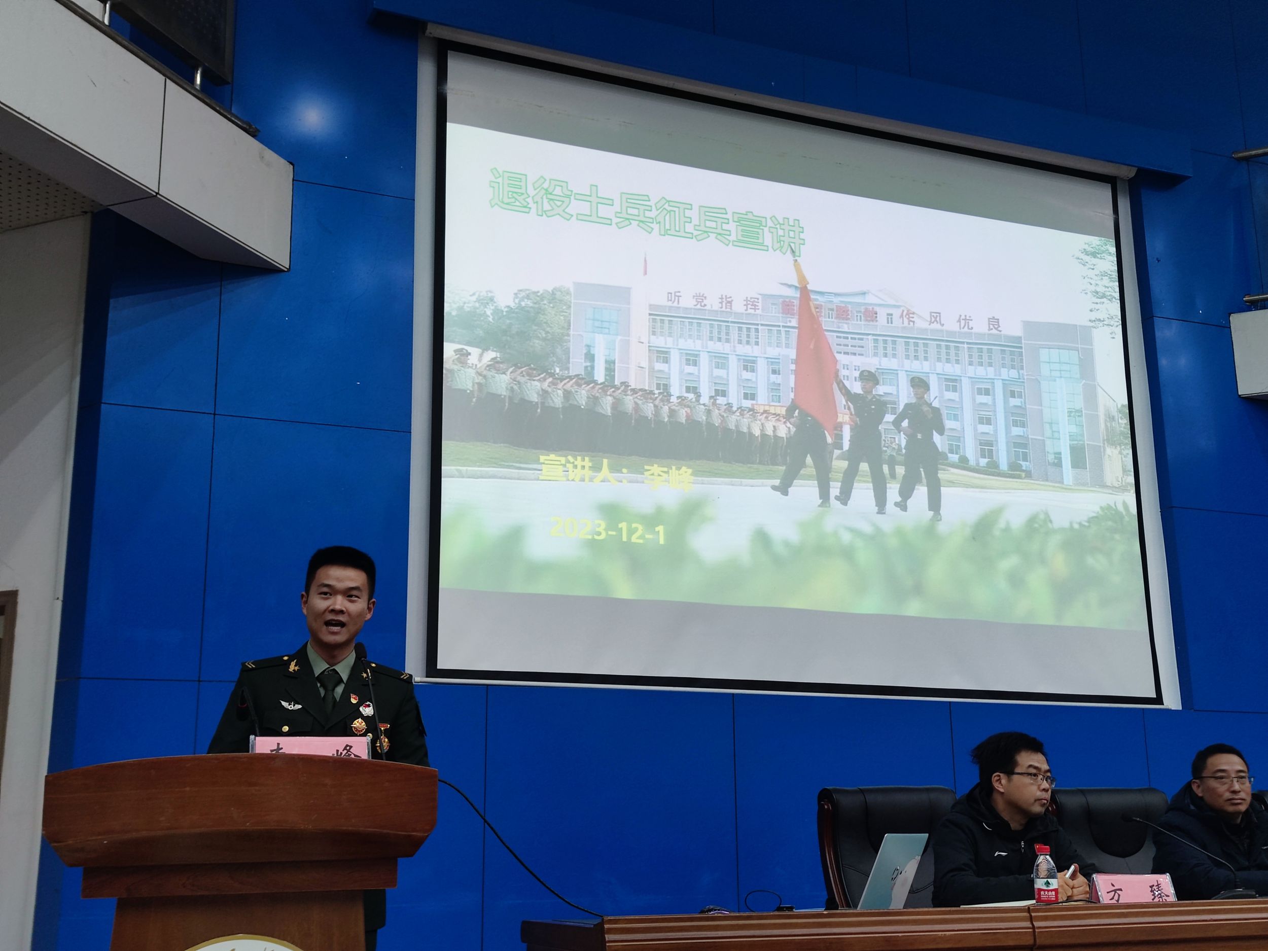 在应征入伍动员大会上,为鼓励2024届毕业班学子应征入伍,学院优秀退伍大学生代表李峰同学分享了他两年难忘的军旅生涯,介绍了应届生入伍的诸多优势和优待政策,不仅吸引在座所有同学的注意还赢得了各位领导老师的赞许。希望同学们谨记习近平总书记对应征入伍的大学生的寄语:“把热血挥洒在实现强军梦想的伟大实践之中,在军队这个大舞台上施展才华”。