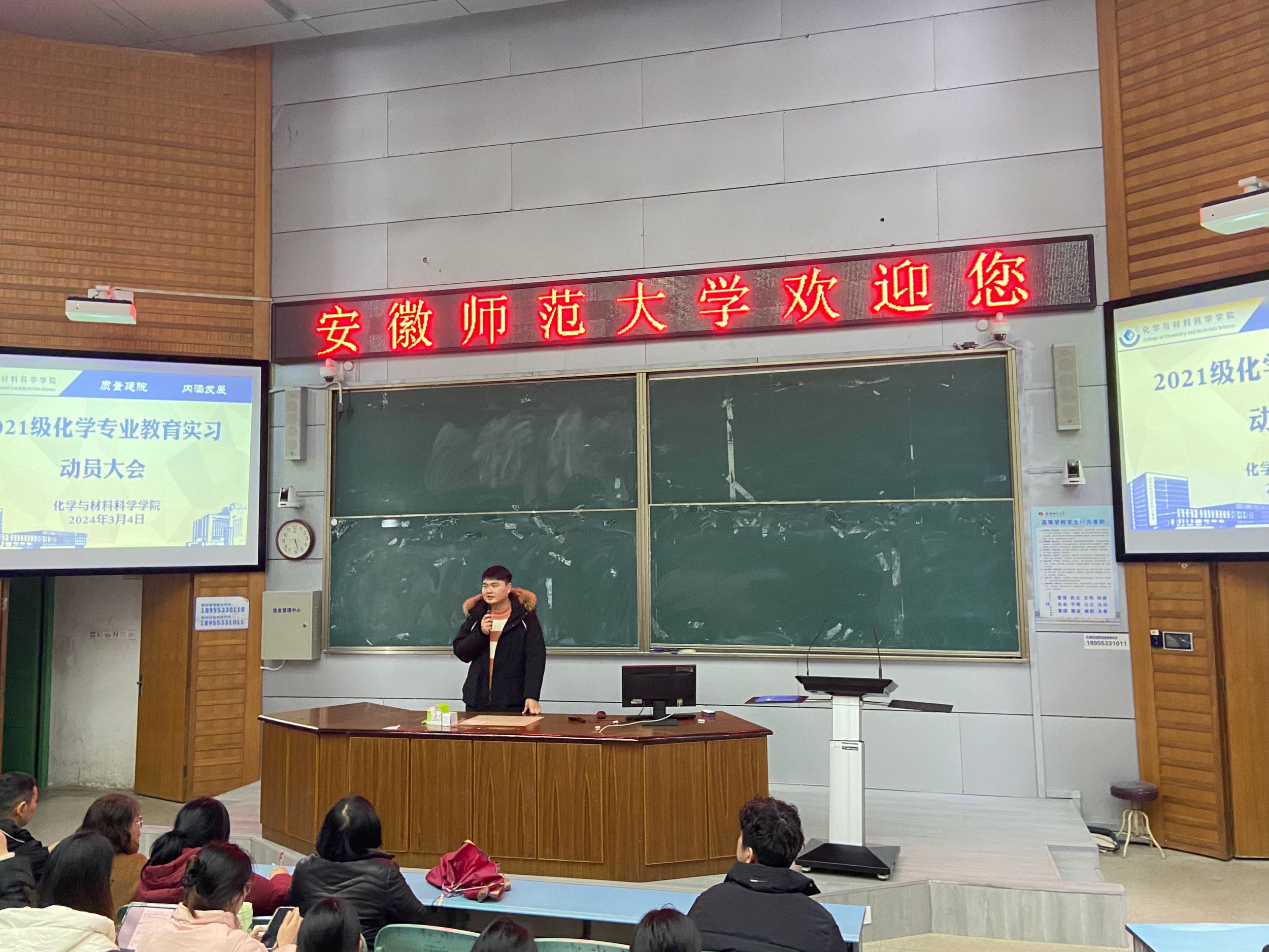 本网讯(美高梅4858线路登录 陶勇)为做好2021级师范专业教育实习工作,引导学生做好教育实习前的各项准备工作,增强学生实习的积极性。3月4日下午,美高梅4858线路登录在2010105教室开展了2021级化学师范专业教育实习动员会议。学院党委副书记李古州、副院长方臻、指导教师代表和2021级化学师范专业全体学生参会,本次会议由辅导员陶勇主持。