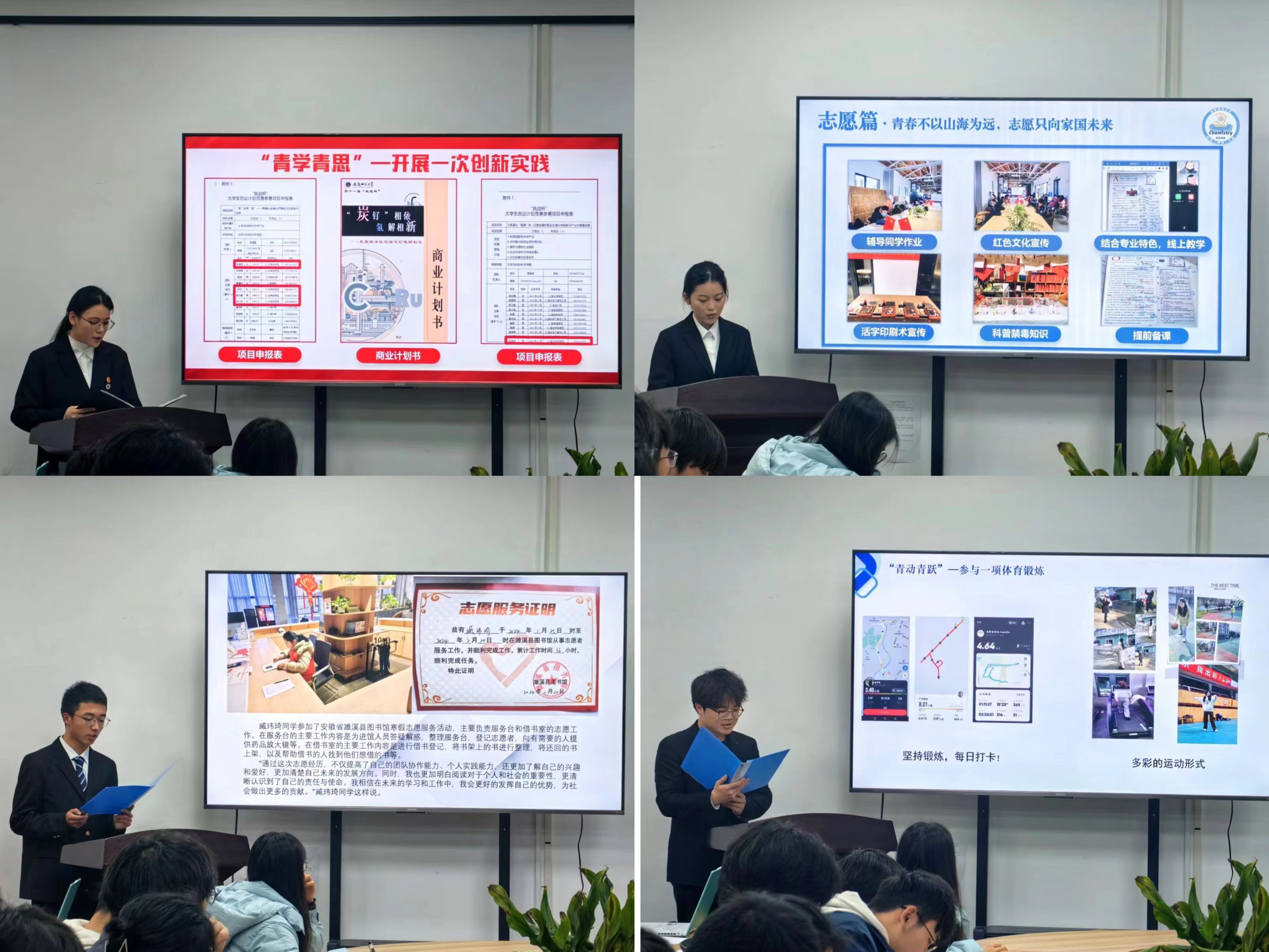 在汇报中,各团支部重点围绕寒假社会实践“青学青思”、“青力青为”、“青寻青讲”、“青访青说”、“青读青悟”、“青动青跃”六大主题活动,积极开展社会调研、青春共读新时代、建设家乡担使命、创新创业展风采、志愿服务在身边以及运动打卡等活动进行分享展示。各团支部书记分享了班级同学的参与情况,并从前期活动准备、开展过程、活动感悟、取得成果等方面多角度的展现出团支部的实践成果,突出各自团支部的寒假实践特色。同学们参与志愿服务,阅读英文文献书籍,调查研究家乡发展变化,开展创新创业实践,积极参与体育锻炼等多种项目。经过前期材料评选、汇报展示,最终评选出8个“最暖团支部”。