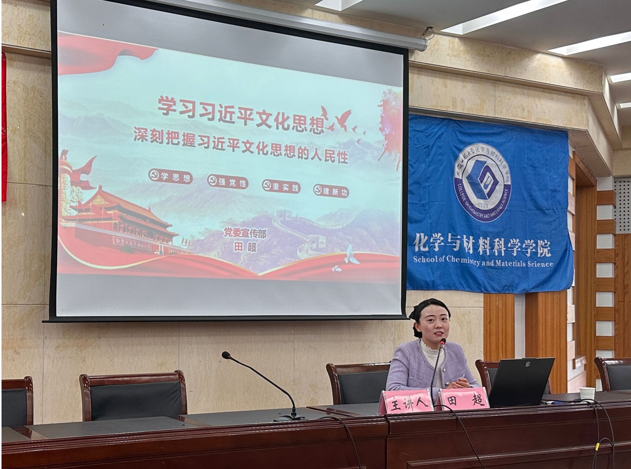 党委宣传部田超以《学习习近平文化思想——深刻把握习近平文化思想的人民性》为主题,通过阐述习近平文化思想的形成过程,强调习近平文化思想是新时代党领导文化建设实践经验的理论总结。除此之外,她从始终坚持人民至上的根本立场科学回答了“为了谁”的问题、坚持以人民为中心的工作导向科学回答了“依靠谁”的问题以及坚持人民是鉴赏家和评判者科学回答了“由谁评判”的问题三个方面进行了详细的阐述。