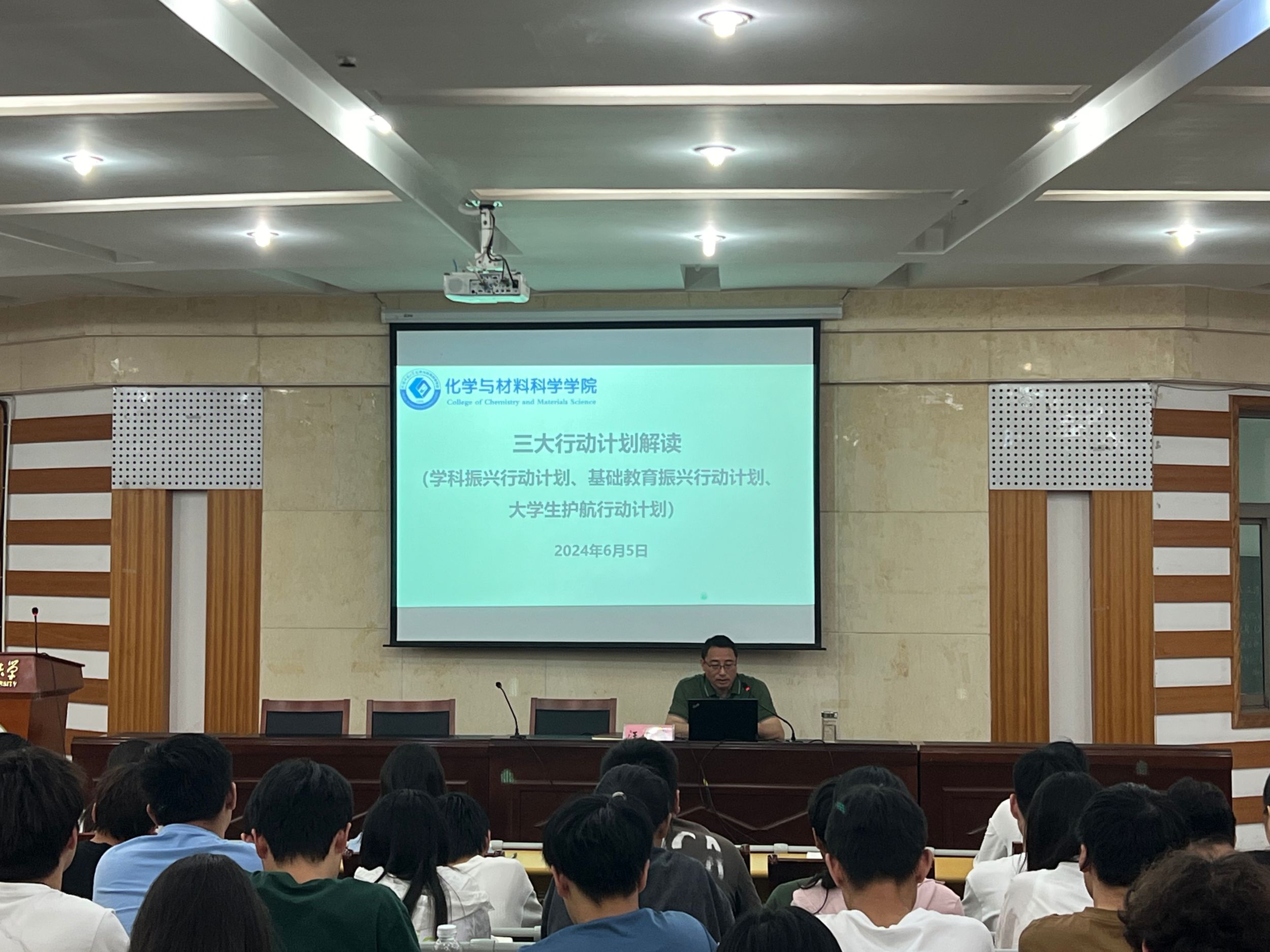 汪俊武详细阐释了“三大行动计划”的具体内涵和深刻意义,并结合学院发展的实际情况,阐明了在学校推进“三大行动计划”、促进高质量发展的进程中,作为化材学子应如何躬身实践、为推动学院事业高质量发展作出青年学生的贡献。
