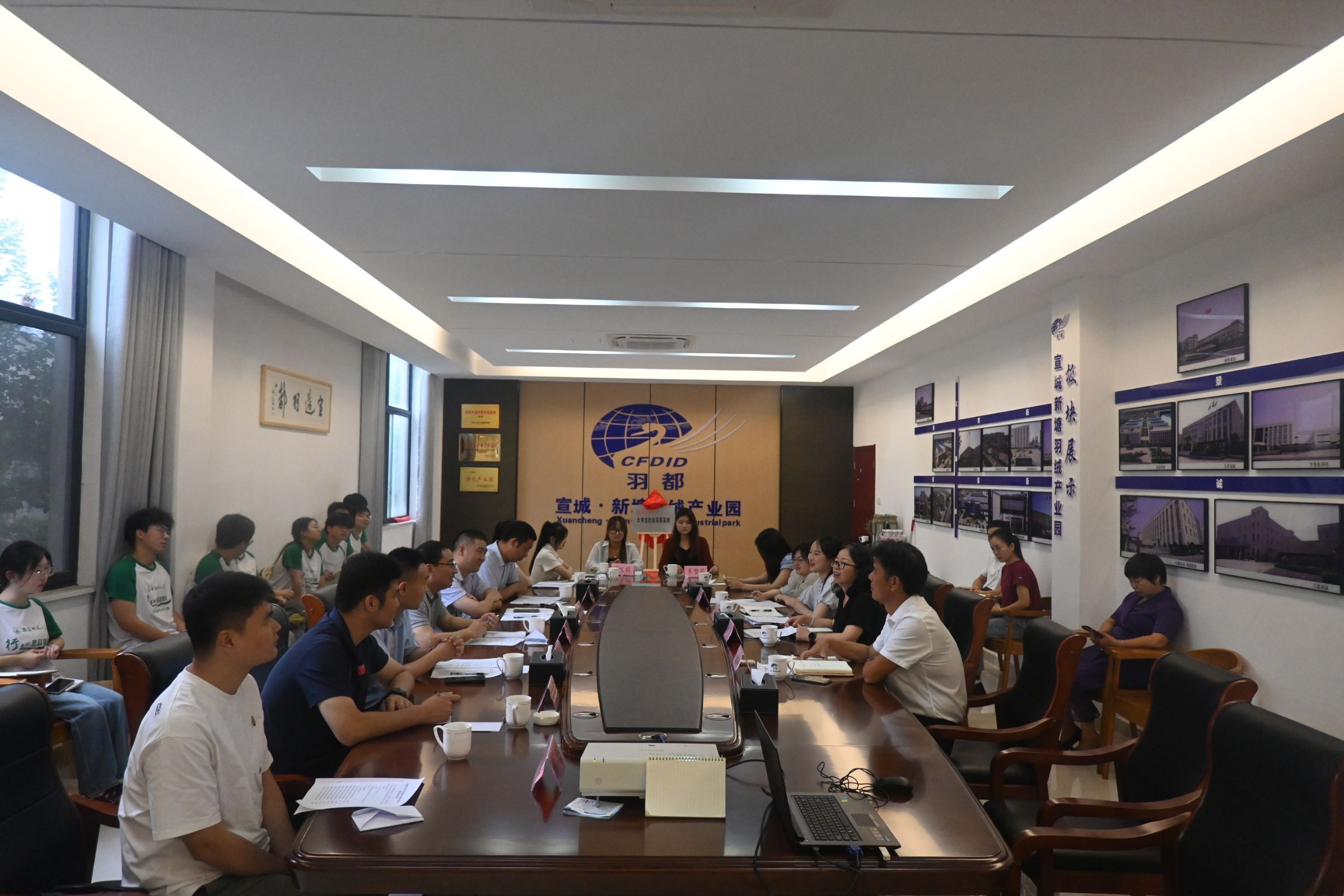 汪俊武一行在宣城新塘羽绒园建设投资有限公司会议室参加“翼展宣城梦,绿筑未来行”社会实践团队座谈会。宣城现代服务业产业园区党工委委员、管委会副主任方竞,杭州萧山新塘街道驻宣联络办主任喻国强、宣城新塘羽绒园建设投资有限公司财务总监叶海燕、宣城新塘羽绒园建设投资有限公司行政主管张瑛参加座谈会。会议由管委会团工委书记宫玥主持。