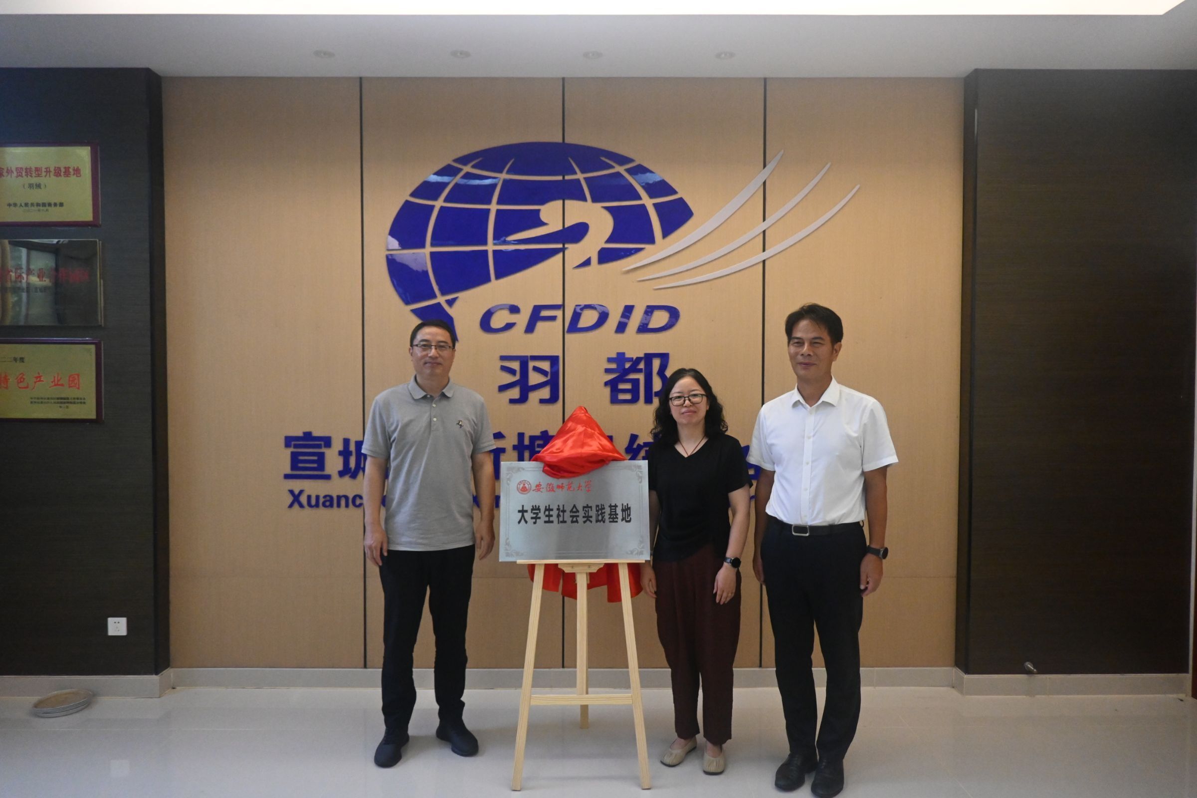 汪俊武与方竞、喻国强共同为安徽师范大学在宣城市新塘羽绒产业园建立的大学生社会实践基地揭牌,为后续合作打下坚实根基。