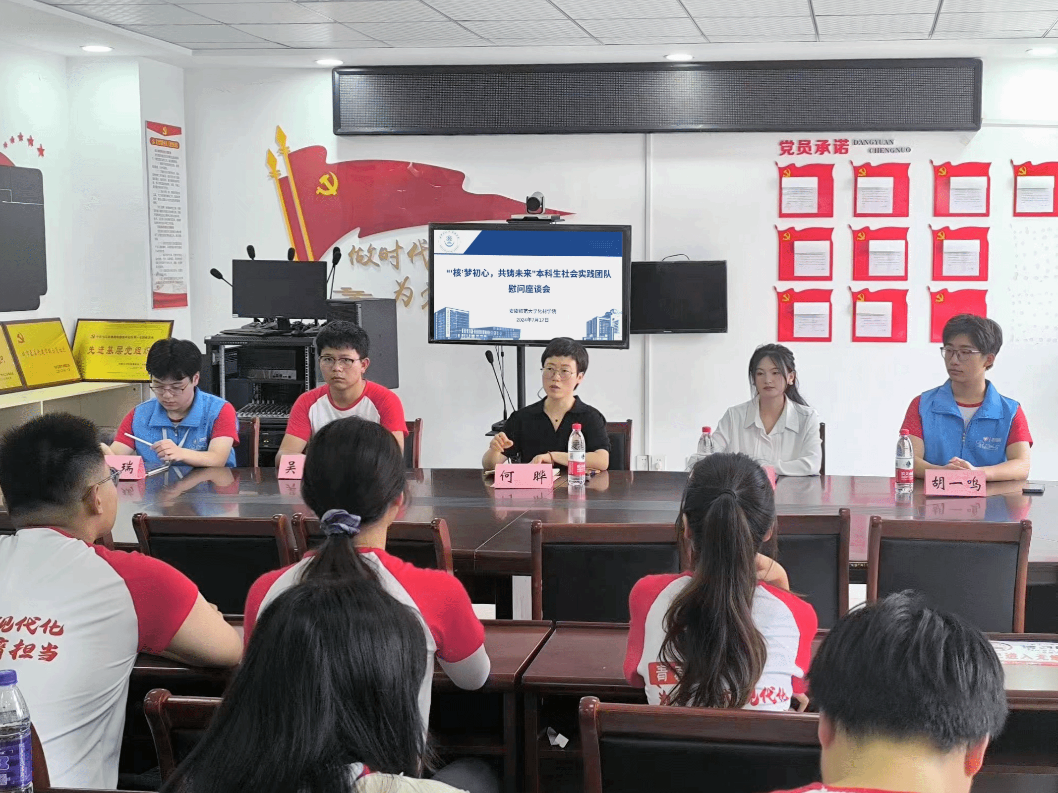 随后,老师何晔、辅导员李汝以及宣讲团的成员们召开了安徽师范大学暑期社会实践团队慰问座谈会。在座谈会上,队长黄瑞向各位老师汇报实践的开展情况,学生代表胡一鸣、刘泽华表达了对本次暑期实践的真实感悟。老师们分别进行了慰问讲话。何晔老师强调了中国核事业中“两弹一星”精神的重要性,表示实践与教育要相结合,多措并举培养综合性人才,同时,也对团队的工作表达了高度的肯定。团队指导老师李汝进行了总结讲话,系统梳理了本次活动的详细情况,并指出青年大学生要在实践中锤炼本领、增长才干,在社会“大熔炉”中淬炼成长,希望同学们继续扎扎实实做好志愿服务活动,时刻铭记师大学子的优良品德,彰显师大学子的良好面貌。