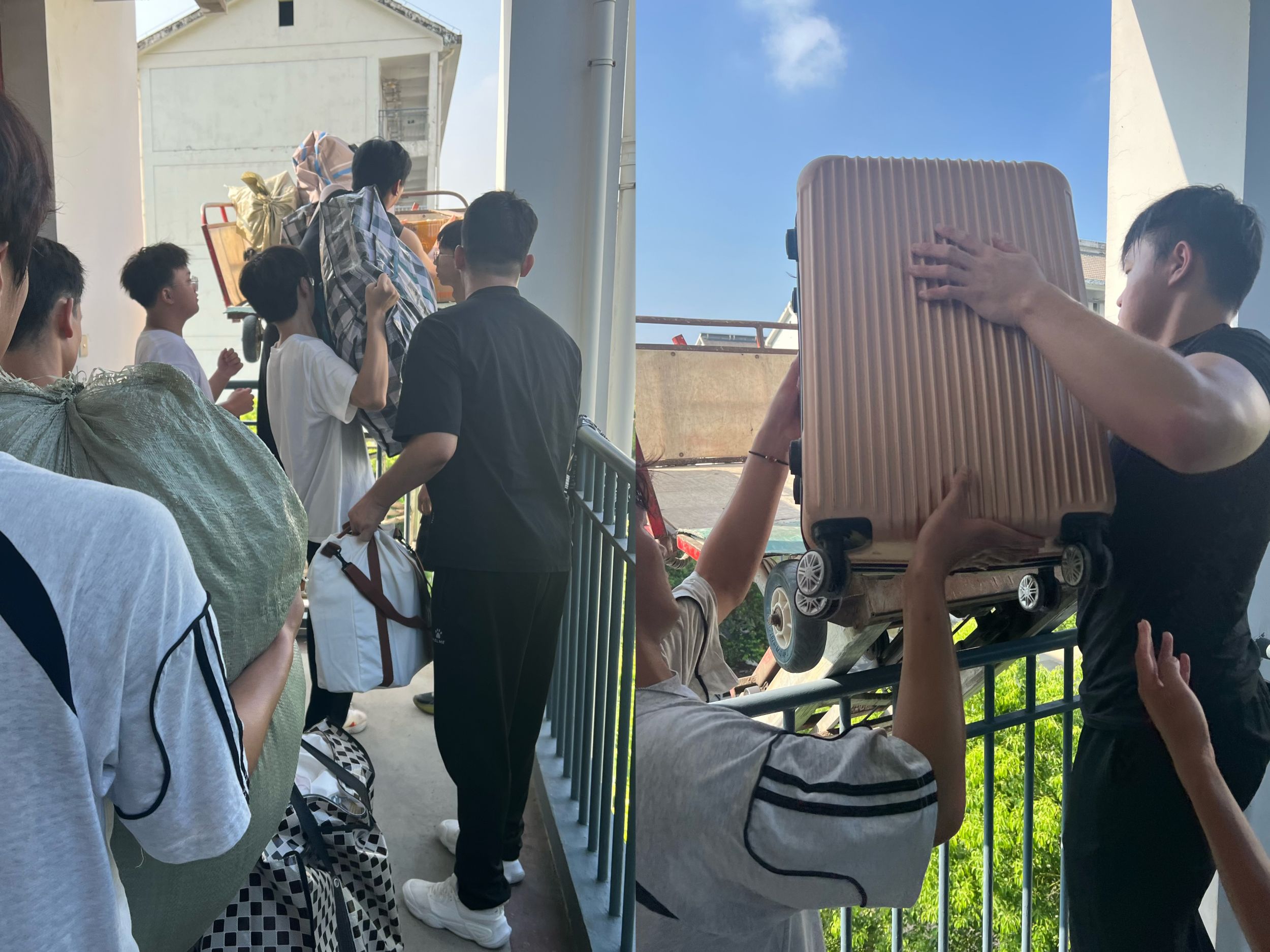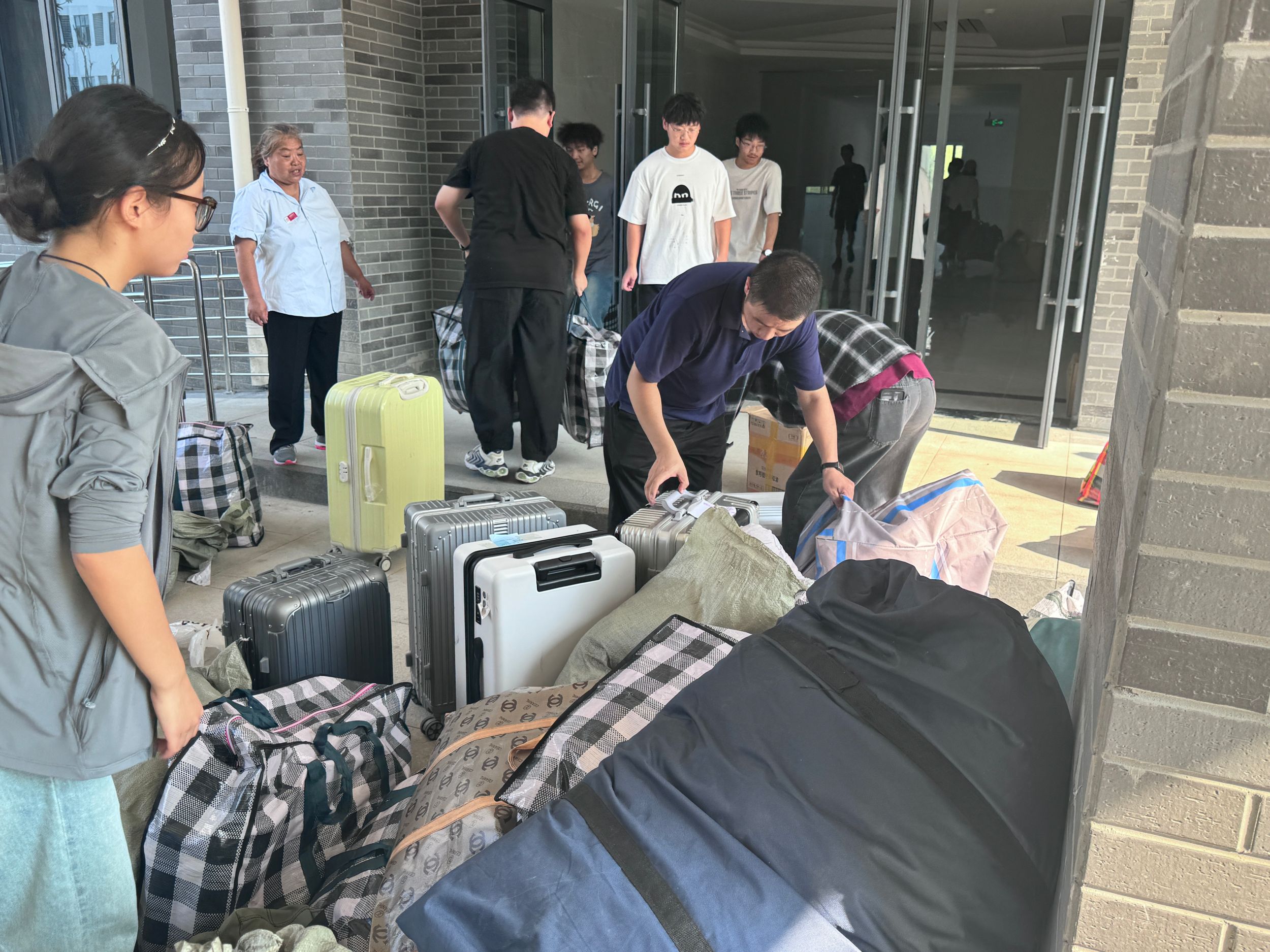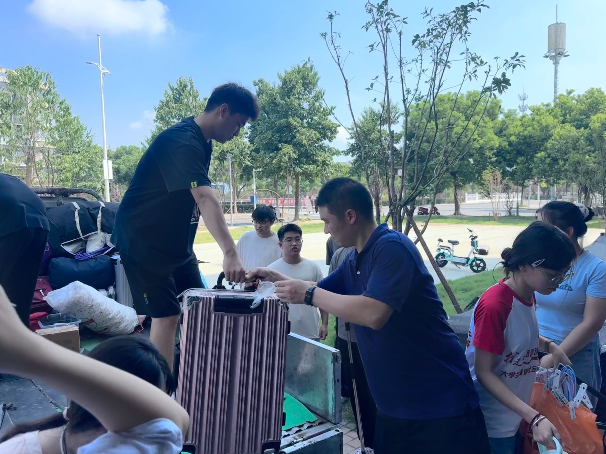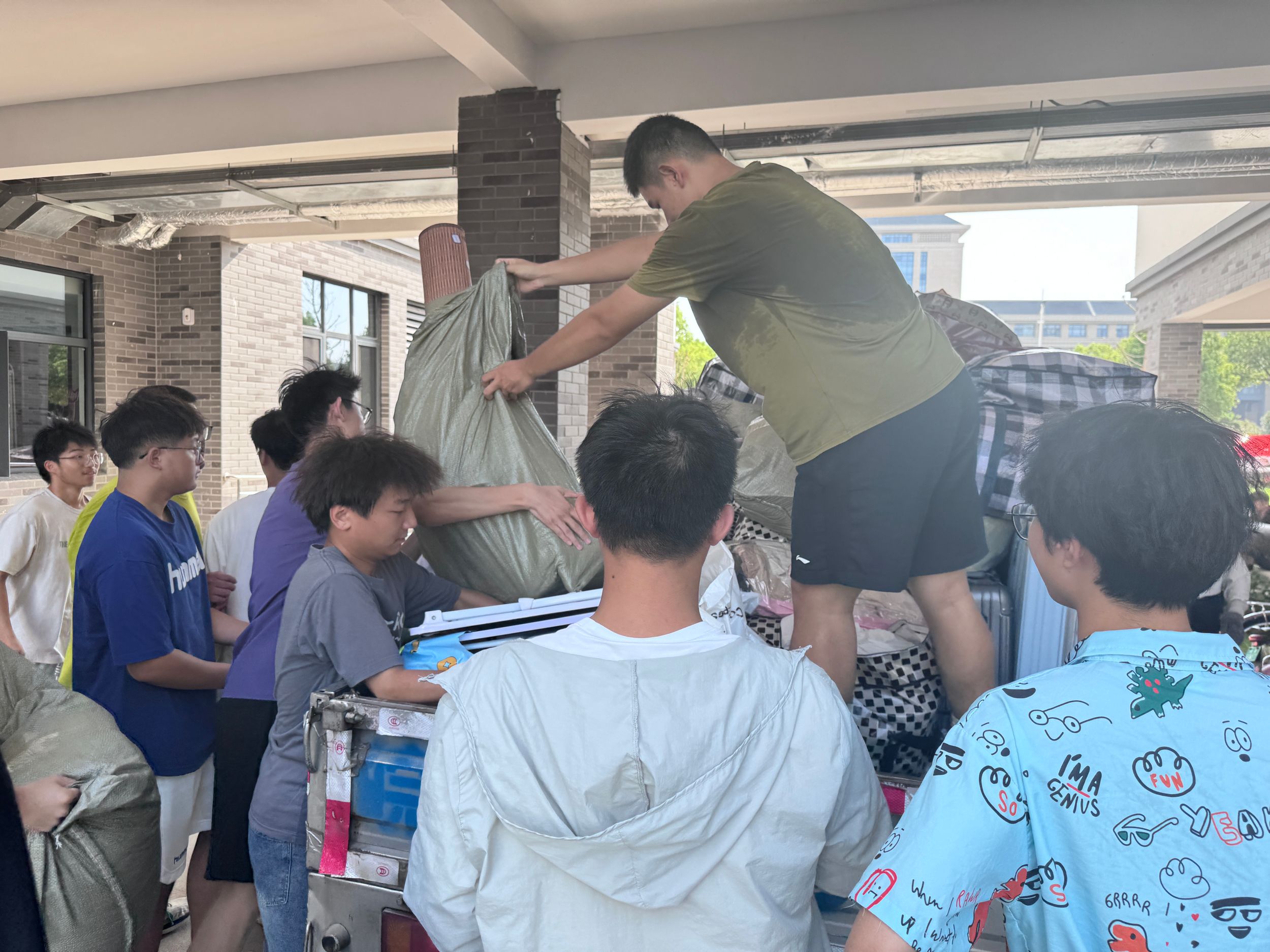 不惧酷暑,同心协力。宿舍搬迁现场,学院党委副书记李古州、团委书记梅冠东与全体专兼职辅导员一道,参与进搬迁工作中,协调现场物品运送秩序,帮助同学们托举重物行李。一包包贴着标签的行李整齐的排列在货车上,学生志愿者在行李运送的每个环节都紧密协作,做到行李物品“零遗失”。