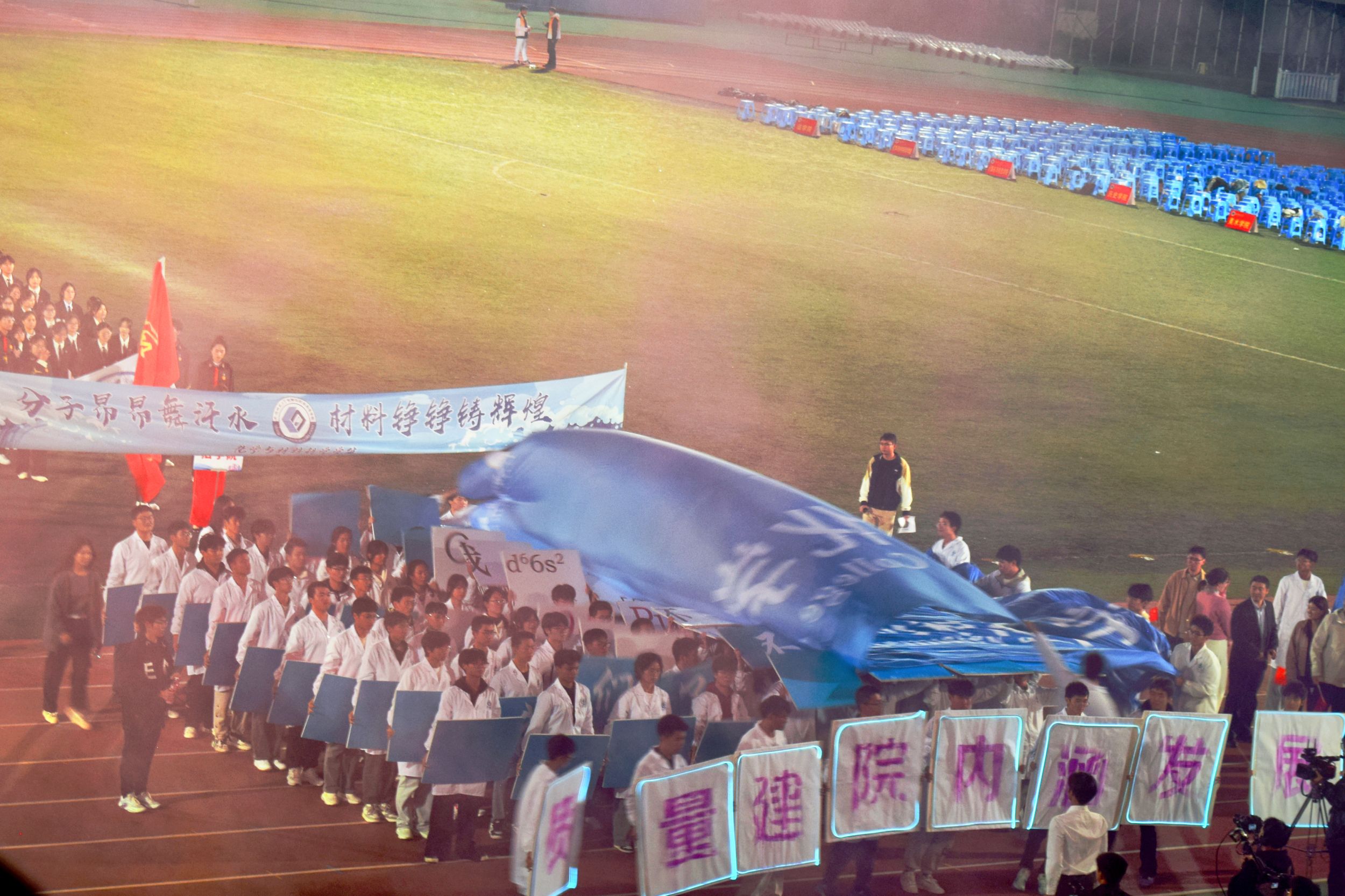 舞动诗篇,创意展示。10月23日晚校运动会开幕式上,步伐整齐有力的方阵队,伴着响亮的口号入场。美高梅4858线路登录方阵以爱心为背景向中华人民共和国成立75周年献礼,他们以“化韵飞扬,青春激昂,材力非凡,共创辉煌”为口号,借用“化学元素”展示着“锇钔钌钚锝(我们了不得)”的豪情壮言。碱遇酚酞溶液变红的原理被巧妙地运用于喷画展示,八位同学各举一字,“质量建院、内涵发展”院训在灯带的映衬下,熠熠生辉。