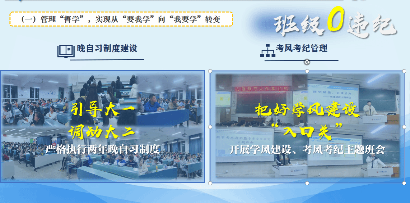 学风“促学”,实现从“塑身型”向“铸灵魂”升级。班级通过创设“榜样面对面”活动,宣传先进典型,发挥模范示范作用,通过主题班会、经验交流会等营造“比班风,正学风”的良好学习氛围。