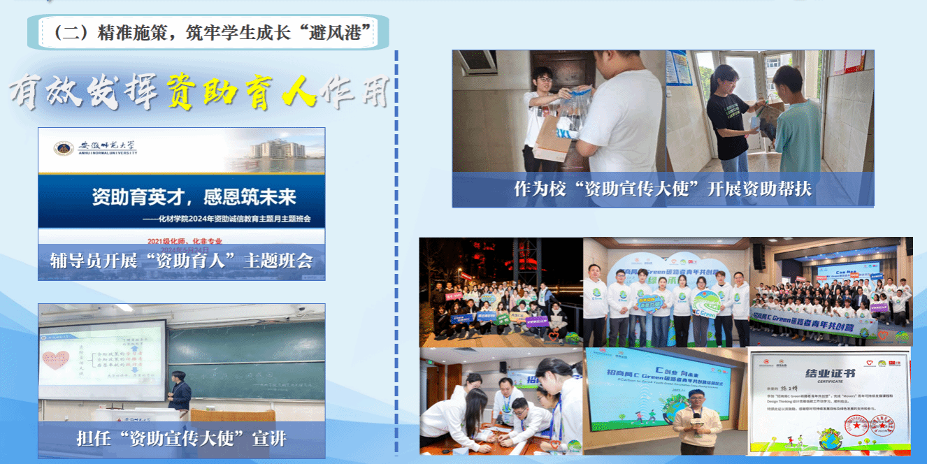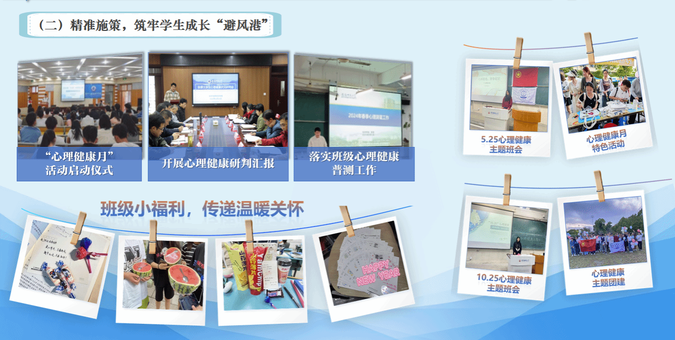 精准施策,筑牢学生成长“避风港”。班级实施特殊群体关爱项目,持续推进学生帮学志愿服务岗、教师帮学导师团,定期召开学业预警学生座谈会、家长会,切实做好对学业困难学生的帮扶、教育工作。班级有效发挥资助育人作用,做好典型选树和感恩教育,同时落实闭环工作机制,定期做好心理健康普测,做好不同阶段心理疏导工作。