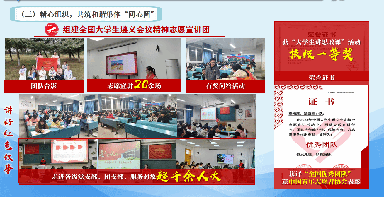 精心组织,共筑和谐集体“同心圆”。班级社会实践和志愿服务参与率100%,志愿服务总时长近10000小时,班级同学组建全国大学生遵义会议精神志愿宣讲团,获中国青年志愿者协会表彰,获评“全国优秀团队”。三年以来,班级多次开展特色文体活动,种种福利,张张合影,洋溢着真挚的情感。