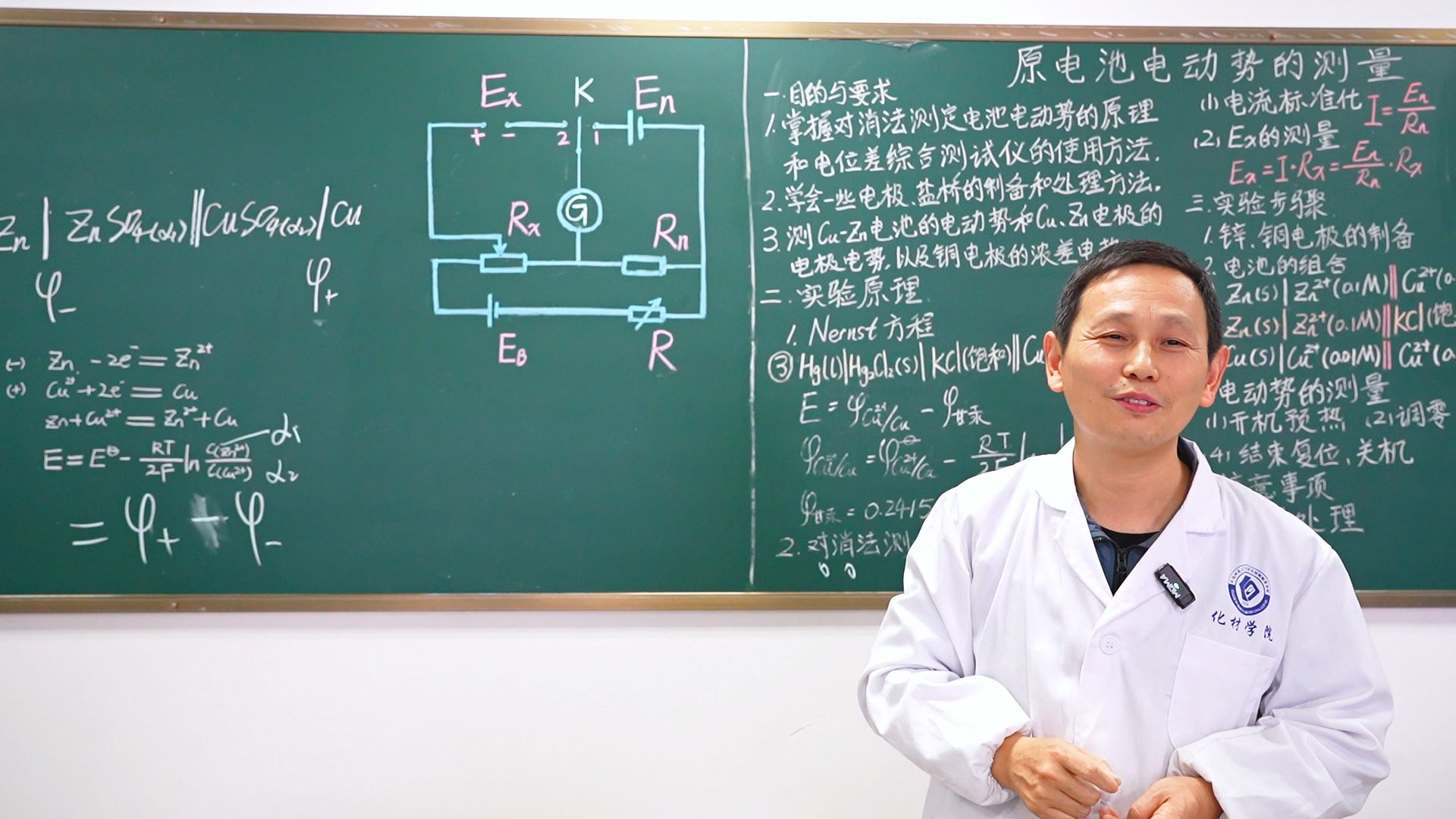 课堂上,陈华茂老师首先概述了实验课的目标与要求,引导学生思考原电池电动势的组成,进而提出了如何测量原电池电动势。在讲解实验原理的过程中,陈华茂老师注重激发学生的自主思考能力,邀请学生书写铜锌电池的电极反应以其涉及的能斯特方程和提出“为什么在本次实验中不能使用伏特计直接测量?”的问题,随后老师引导学生推出了“想要测量电动势需要几乎没有电流通过两电极”的结论,通过层层引导递进,让学生了解了本次实验仪器所运用的原理与特点。在讲解的最后,陈老师提出了当今现实生活中原电池的应用,以2019年诺贝尔奖和如今锂电池的广泛运用的例子强调了化学福利着当今的人类生活,与同学一起学习习近平总书记考察安徽重要讲话精神,勉励学生在奋力谱写中国式现代化安徽篇章的时代中书写自己的青春。