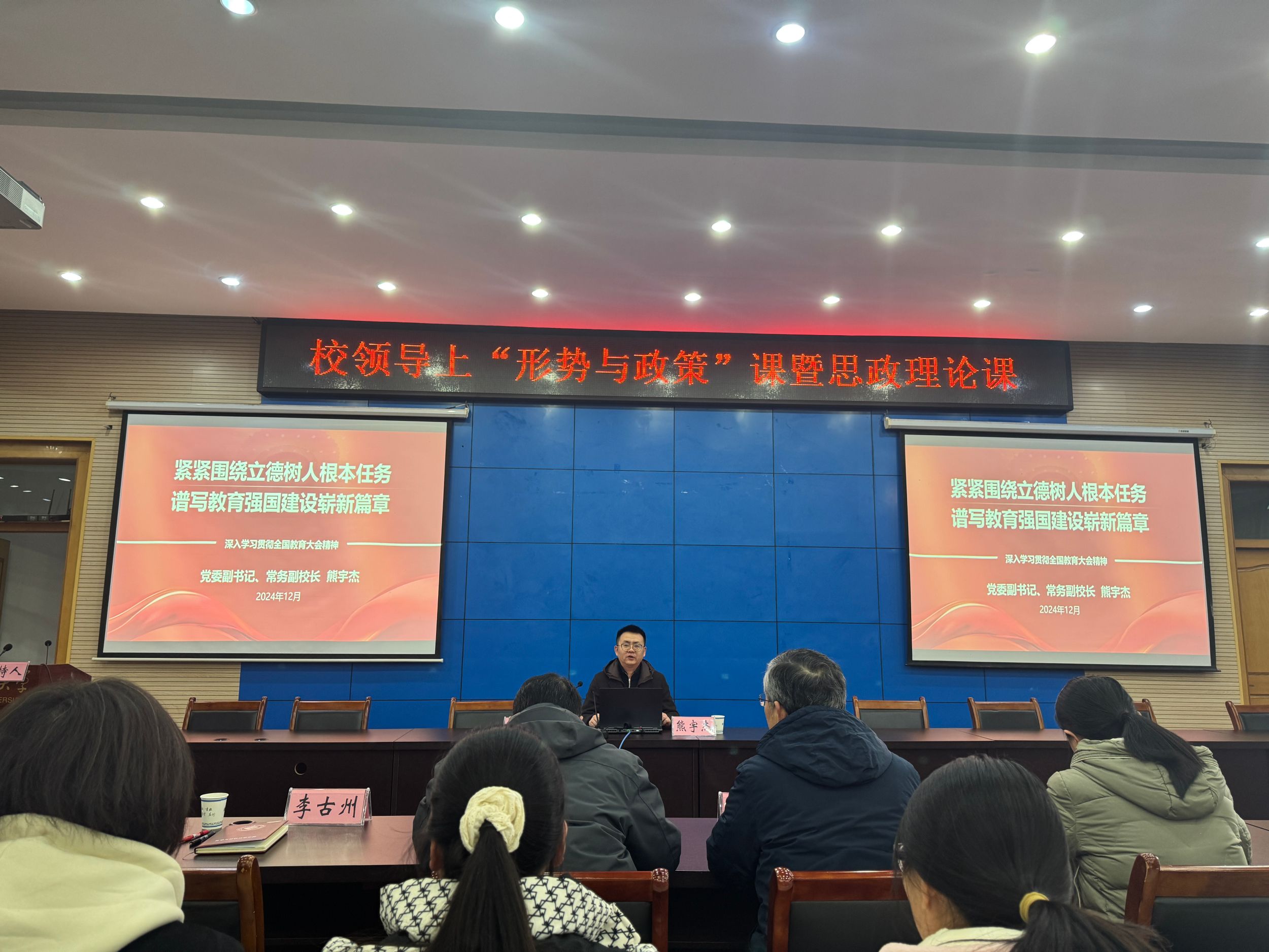 熊宇杰以《紧紧围绕立德树人根本任务,谱写教育强国建设崭新篇章——深入学习贯彻全国教育大会精神》为主题,从“深入学习习近平总书记重要讲话精神、深刻认识全国教育大会的重大意义、全面系统学习宣传全国教育大会精神和推动全国教育大会精神落地见效”四个部分展开阐述。他指出全国教育大会站位高远,立意深远,为教育改革发展指明了前进方向,为教育事业高质量发展提供行了动指南。学校广大师生要深入学习习近平总书记重要讲话精神,全面贯彻落实全国教育大会精神,增强责任感和使命感,拓宽国际化视野,积极进取,为加快建设教育强国、全面建设社会主义现代化国家贡献力量。