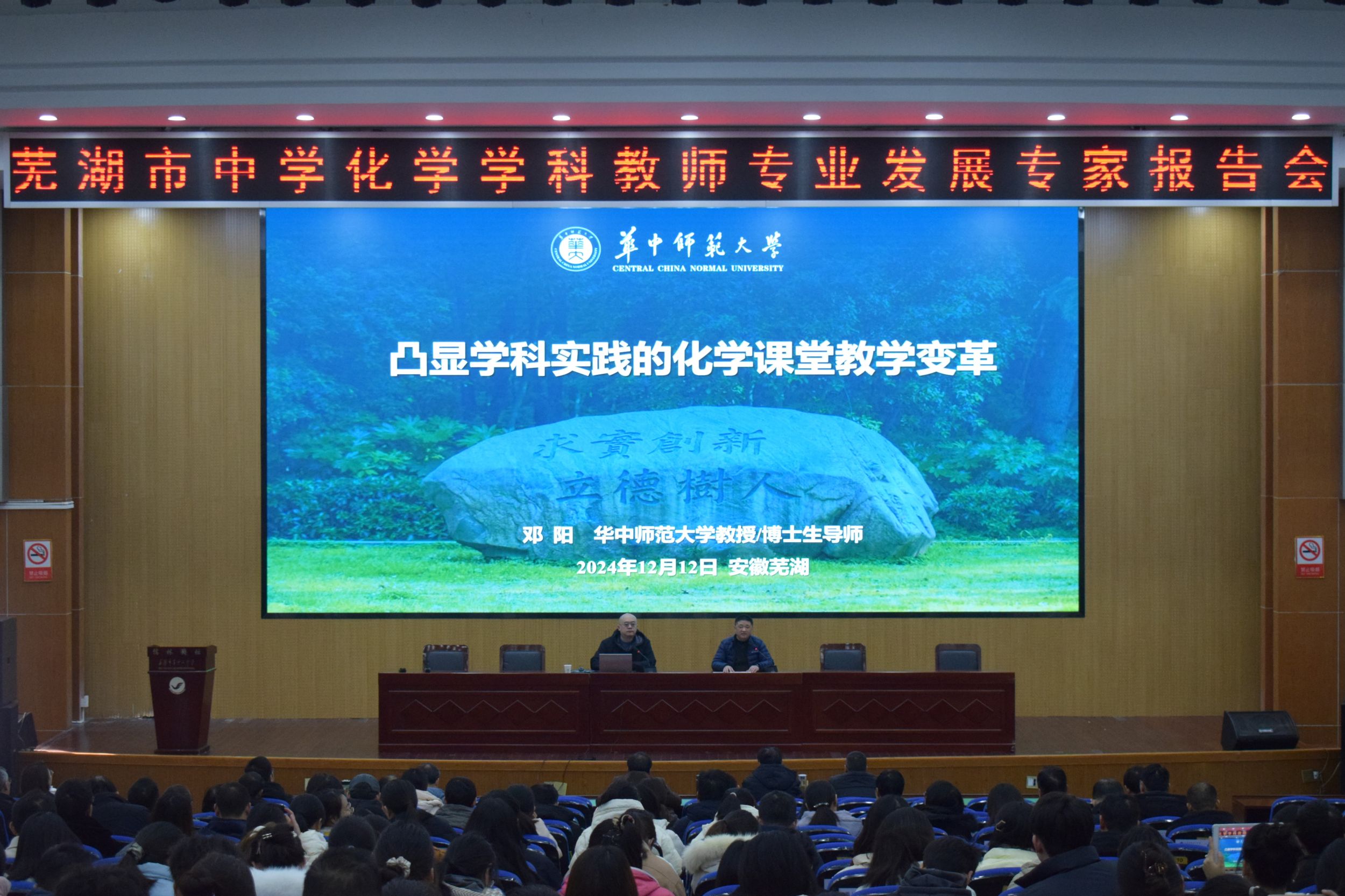 (美高梅4858线路登录 王玮健)12月12日,由芜湖市教育局教研室、芜湖市第十二中学共同举办的中学化学教师专业发展专家报告会如期举行,来自华中师范大学的邓阳教授为在场的师生带来了一场精彩的报告。在学院孙影、程瑶琴、周冬冬三位老师组织安排了美高梅4858线路登录2022级化学师范生的教育见习活动,学生沉浸式参与了本次教研活动。本次报告的主题为“凸现学科实践的化学课堂教学变革”,旨在通过具体案例分析和前沿教育理论,推动化学教学方式的创新与提升。