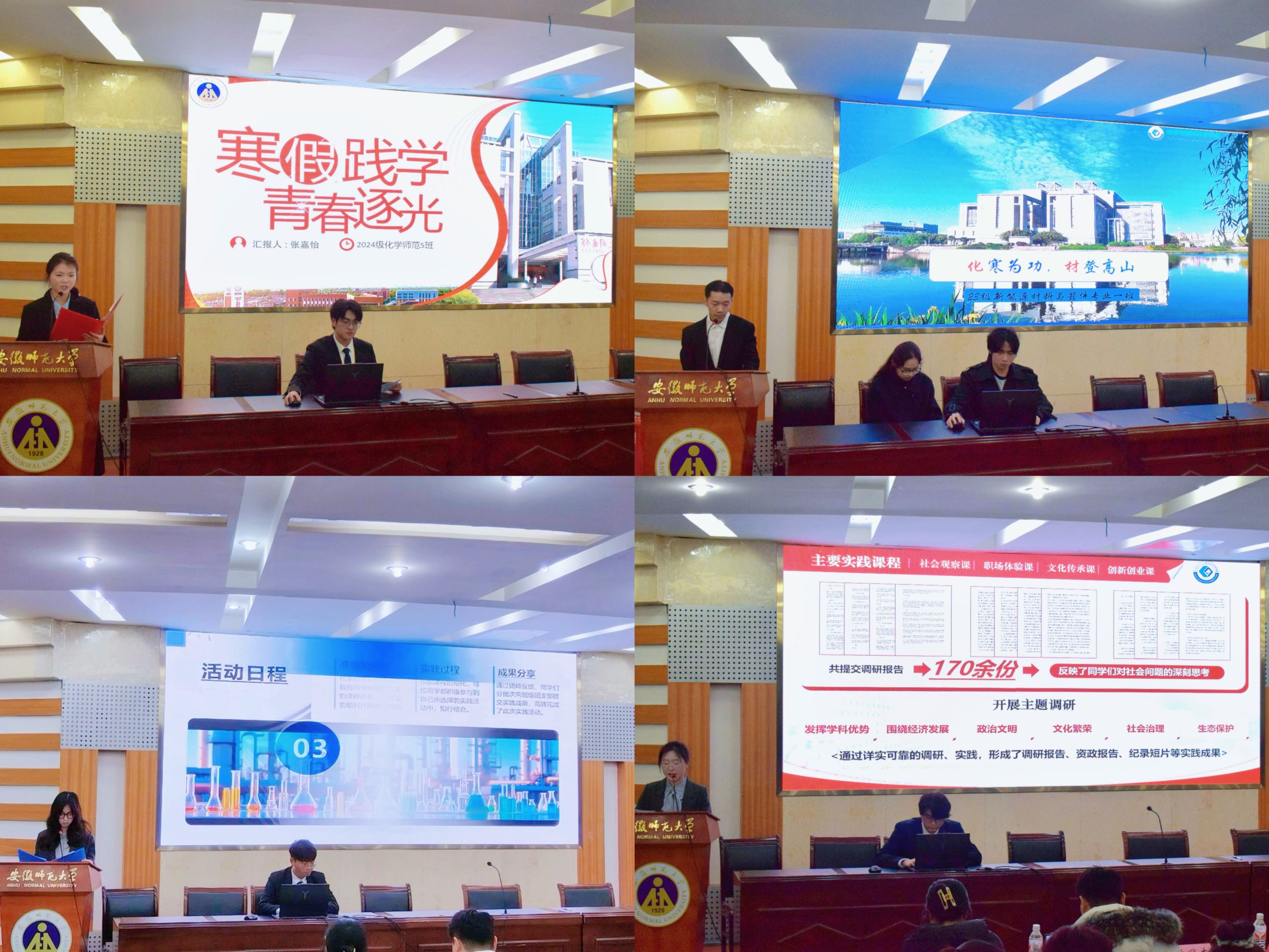 学院团委组织委员刘君蕊对本次寒假社会实践活动的开展情况进行汇报,本次活动学院2023级、2024级本科生全员参与,在八个课题方向共形成调研报告270余份,实践报告130余篇,文化纪录片12部,文创作品50余件,并通过线上线下宣传覆盖受众2000余人,累计服务时长超4000小时,惠及群众3000余人次。全方位展现了化材学子知行合一、服务社会的青春风貌。